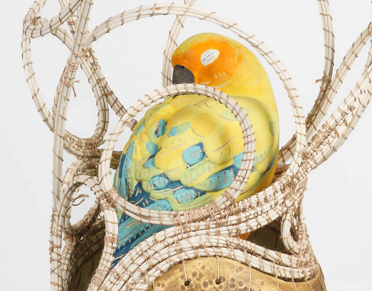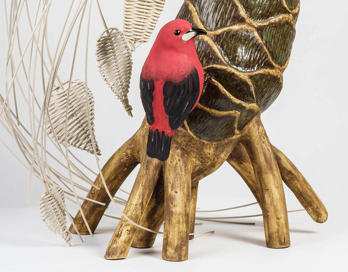 Dimensions: (taller cylinder, with bird on top) 6" x 19" x 6", (shorter) 7" x 15" x 7"