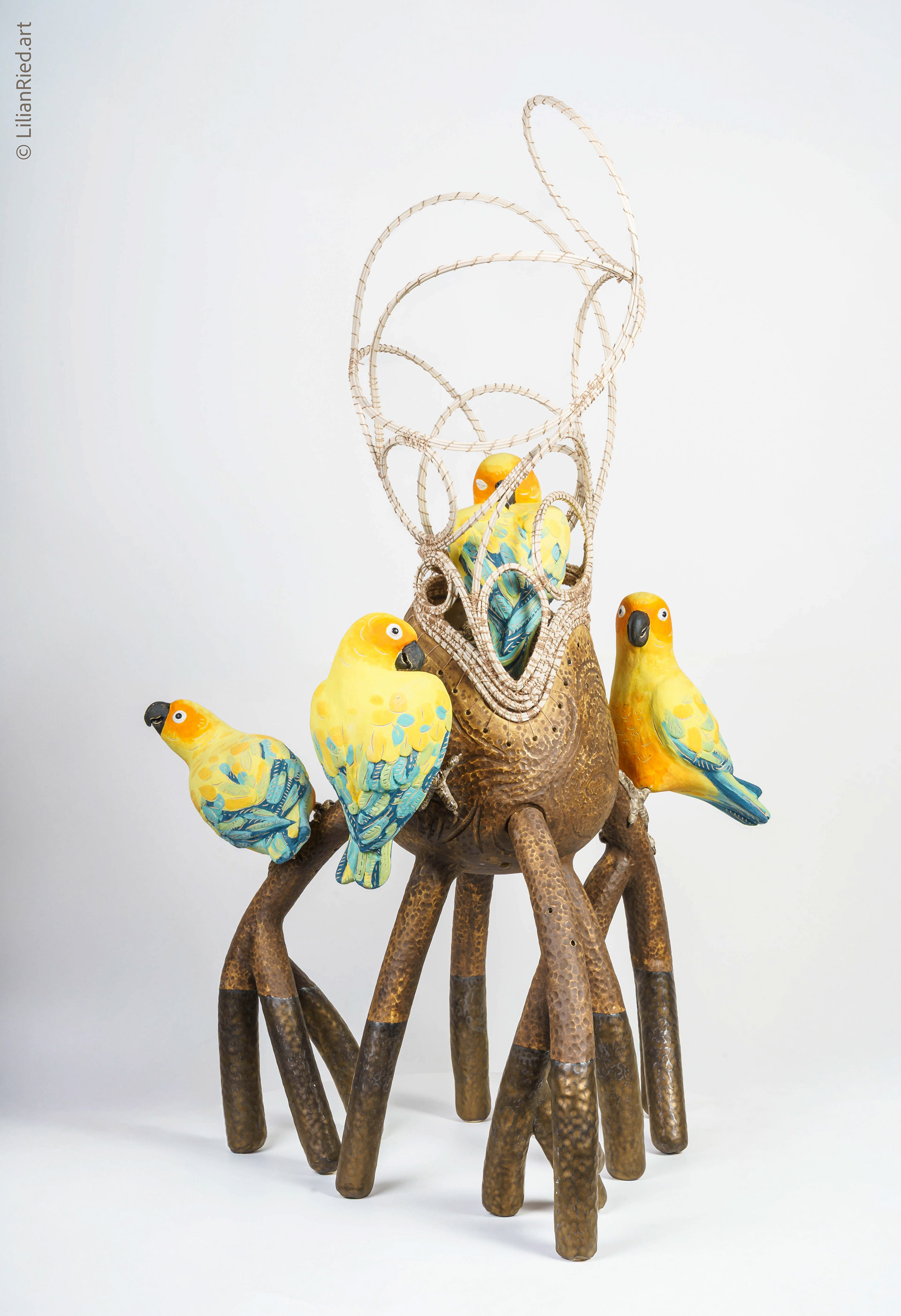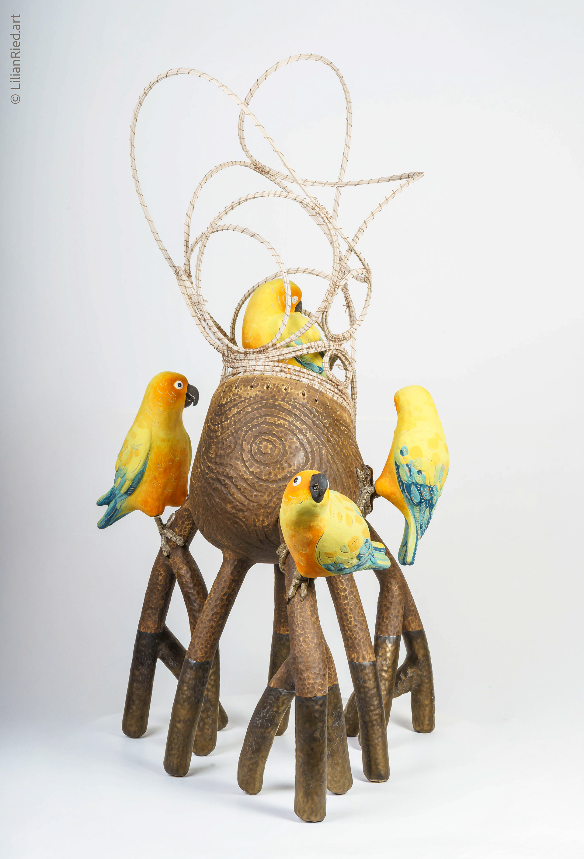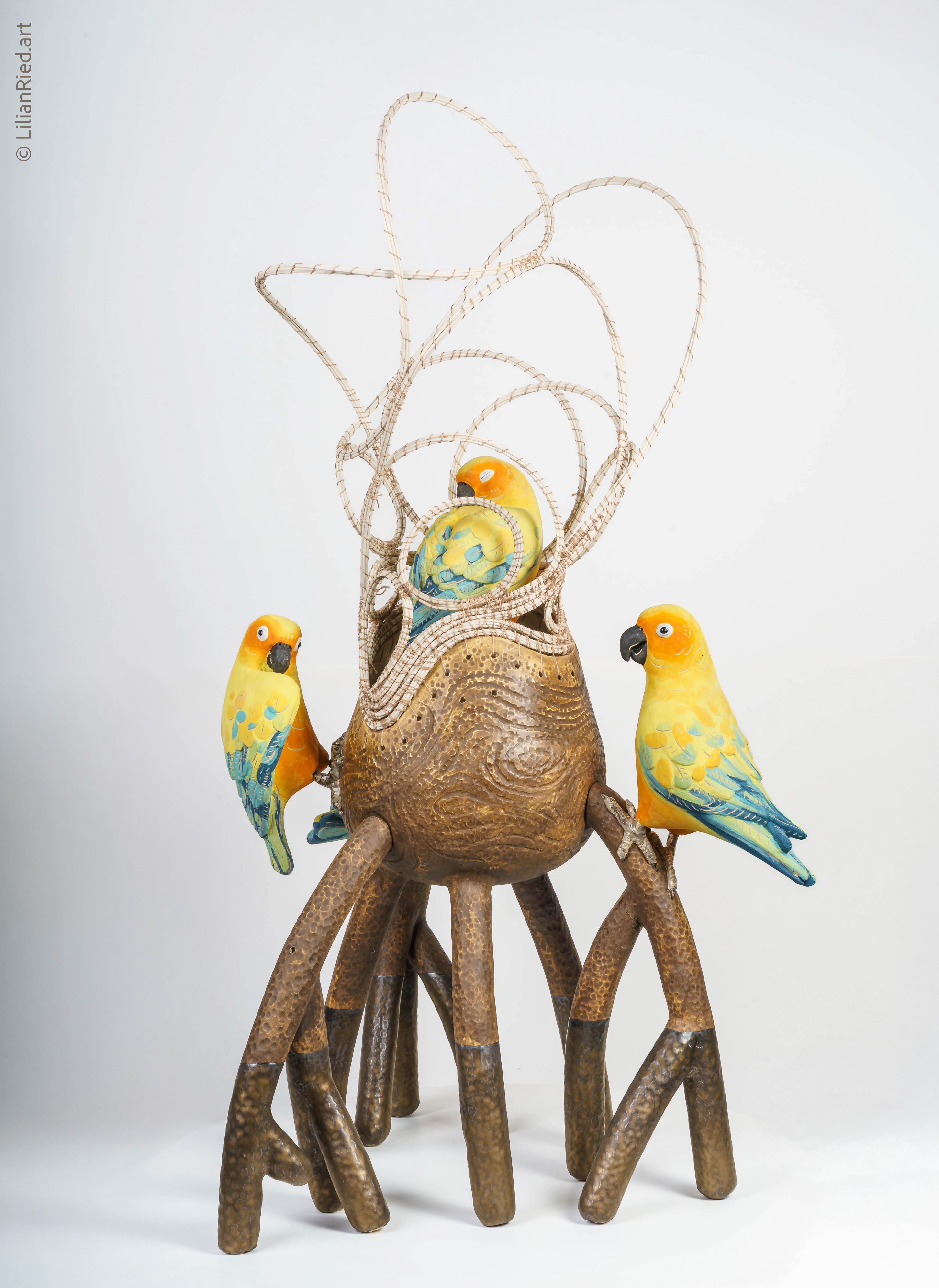 A group of Sun Conures (or Sun Parakeets) gathering together on a mangrove like structure. Hand-built clay sculpture (roots and birds) with a woven reed top forming circular shapes. Stoneware with glazes and oxide washes finishings; reed, cotton yarn, aluminum wire.