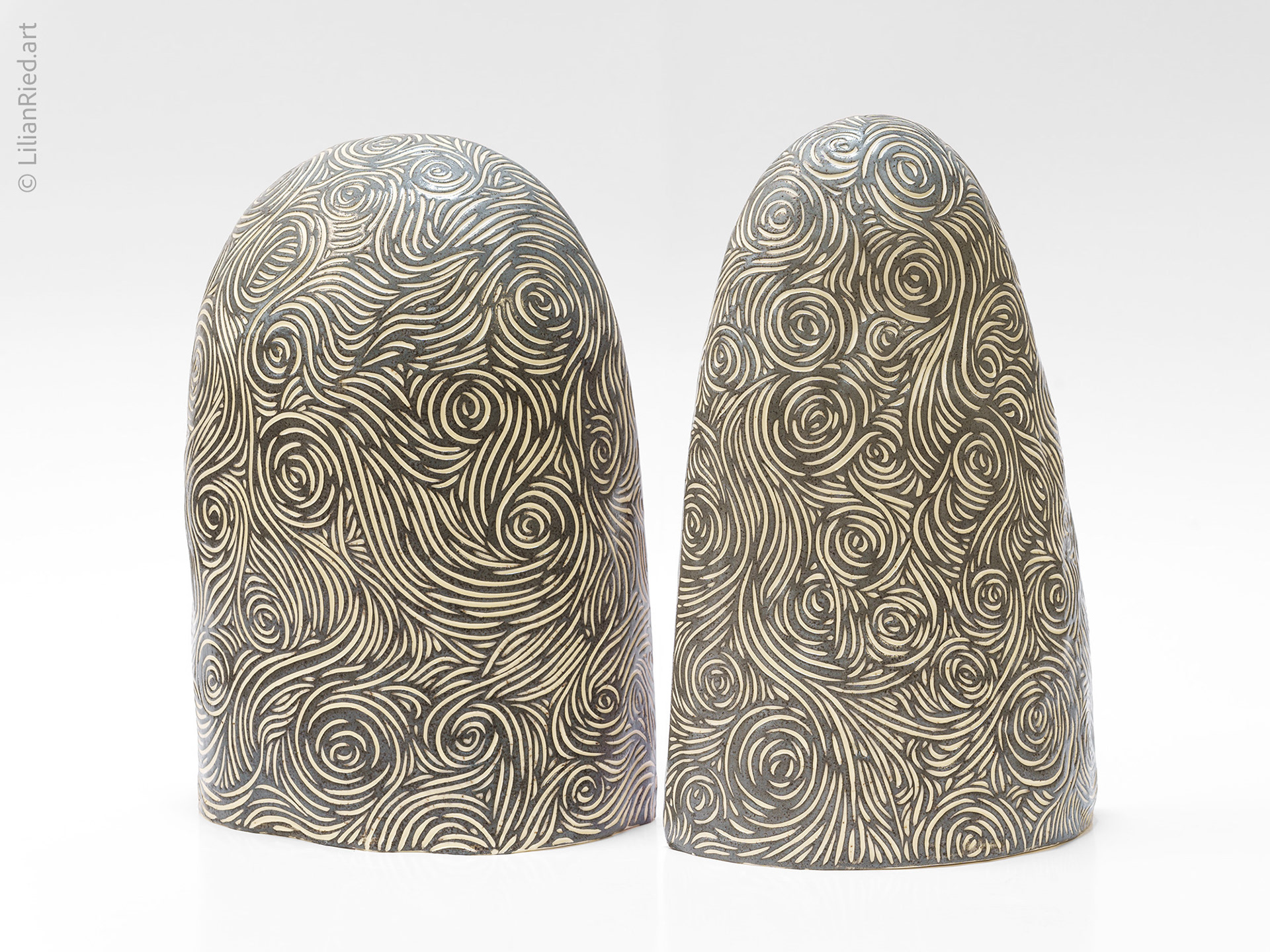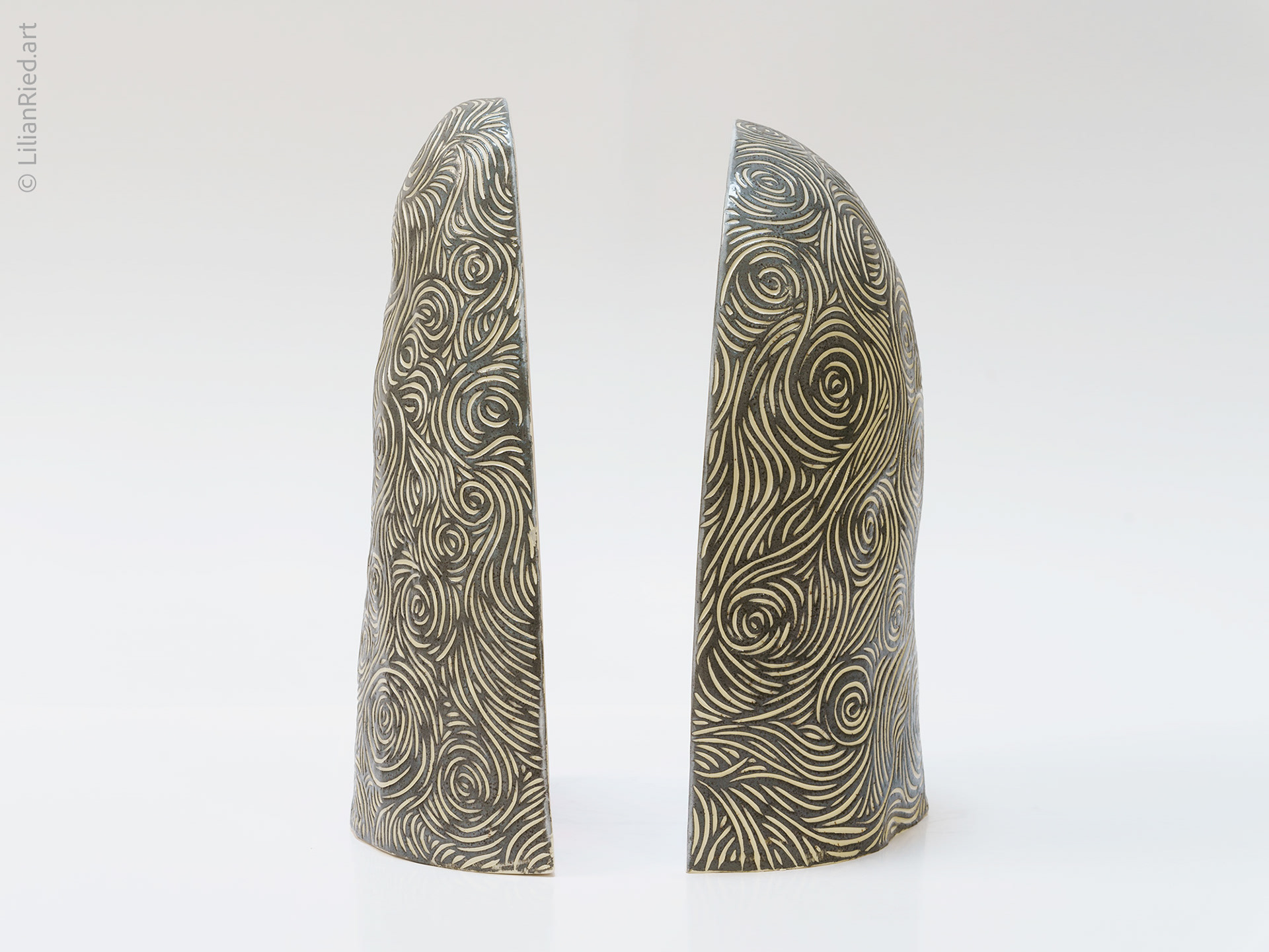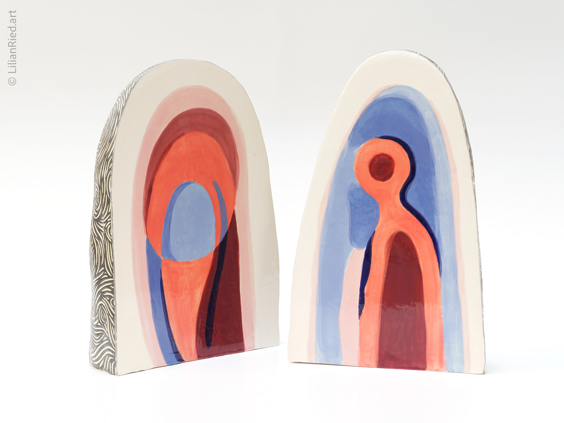 Earthenware set of 2 pieces. Like rocks that reveal unexpected colors and designs when cut in half, in these stelae shaped sculptures the gray sgraffito of the outer texture contrasts with the inner colorful glazed finish, addressing the dazzling sensation of geodes found in nature.