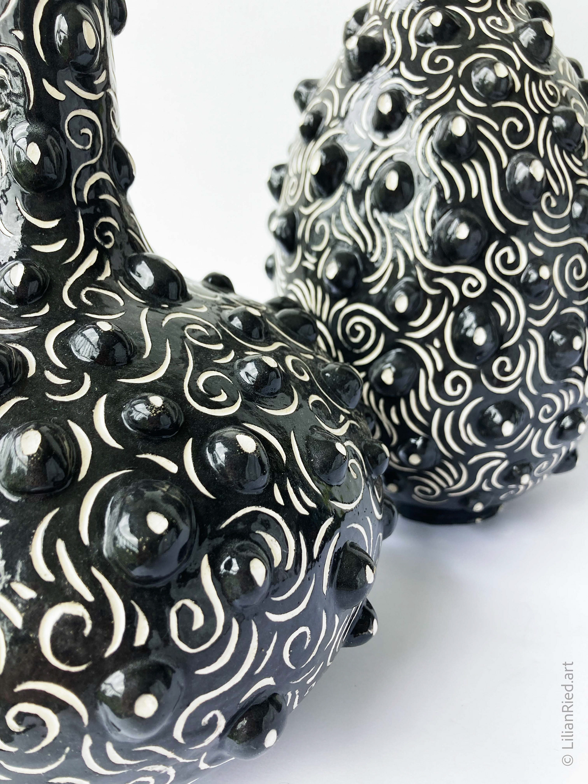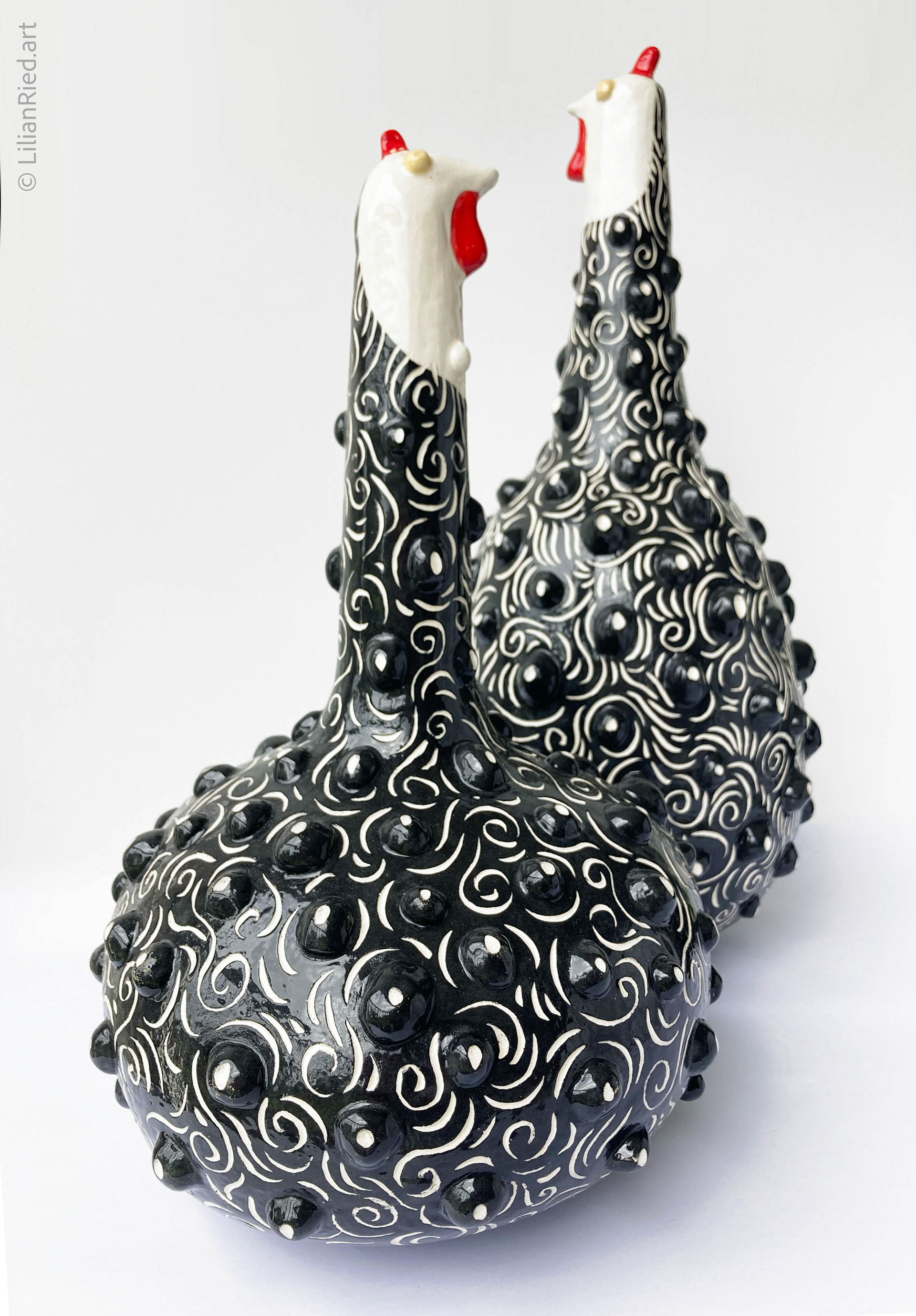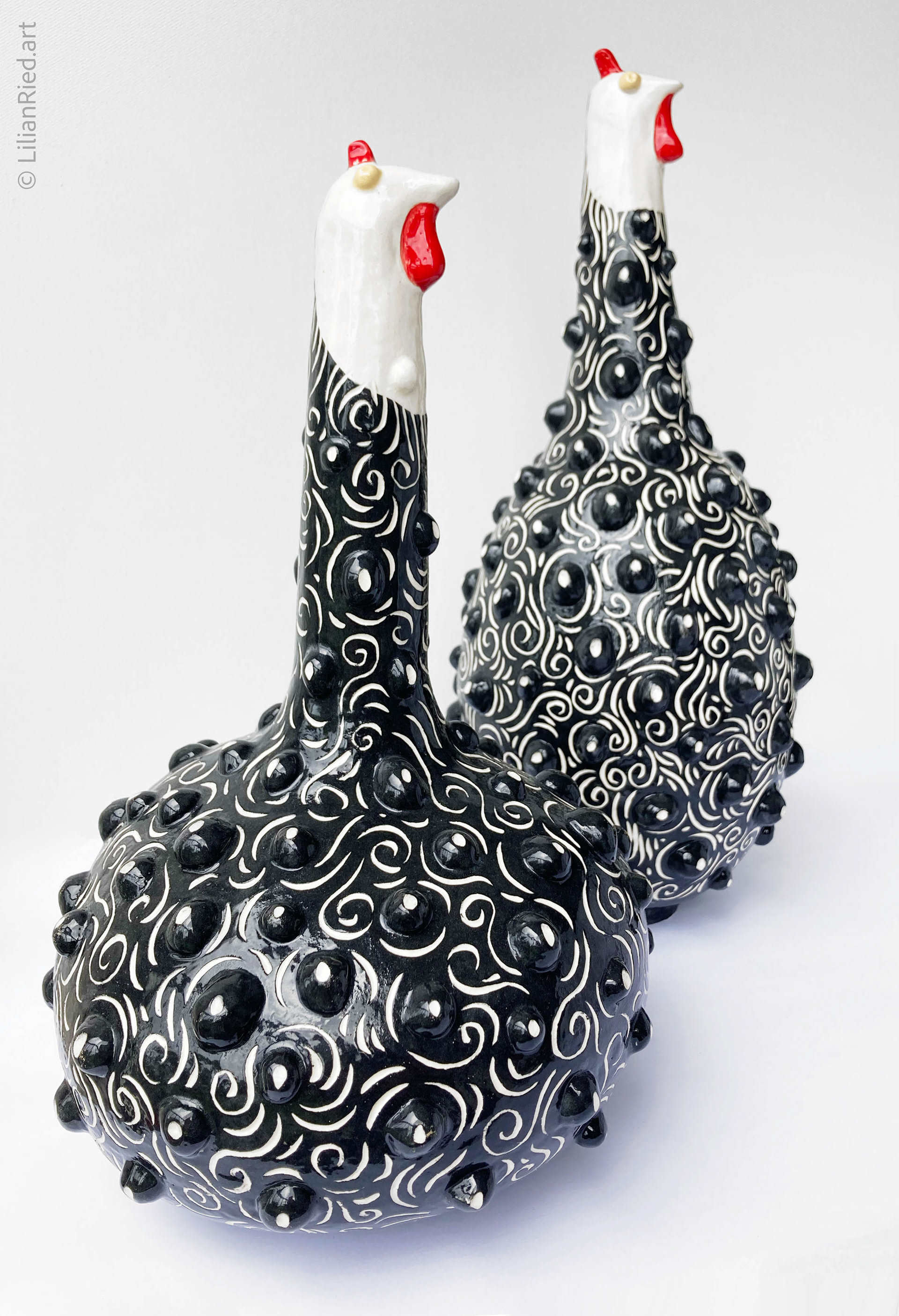 Earthenware set of 2 Guinea hens with sprigging, sgraffito, underglazes and glaze finishings. *This work was the first place winner of the Milton and Florence Hoffman Sculpture Scholarship Award.