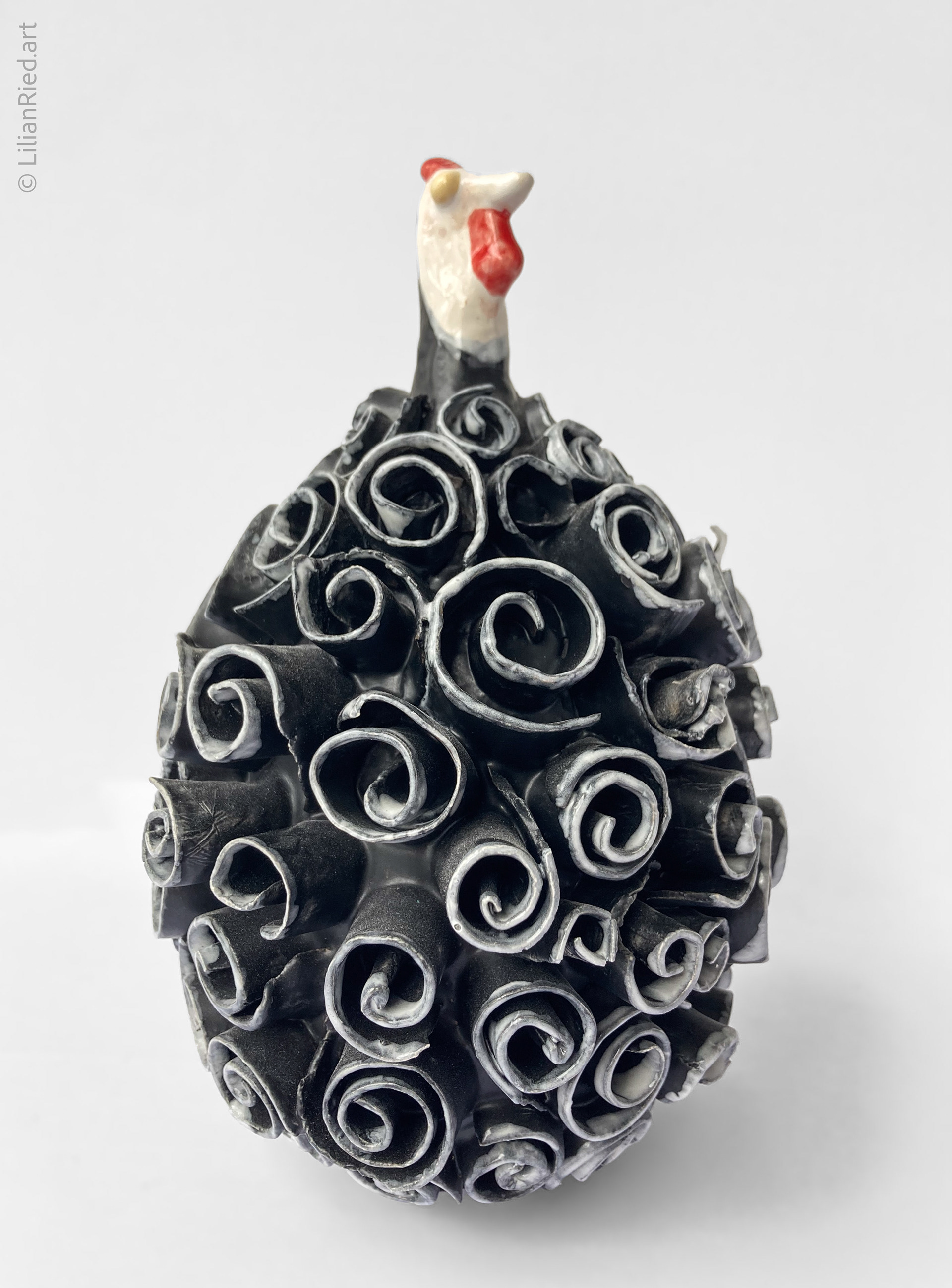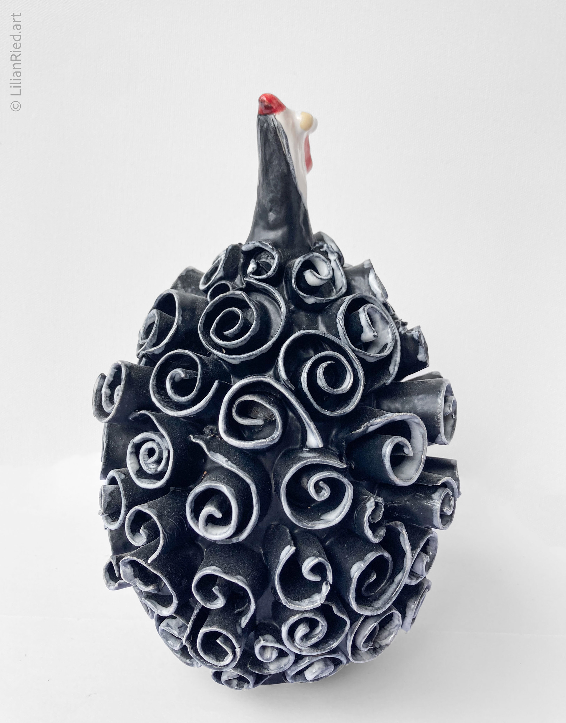 Earthenware with paper clay sprigging, underglazes and glaze finishes, depicting a small version of the guinea hen.