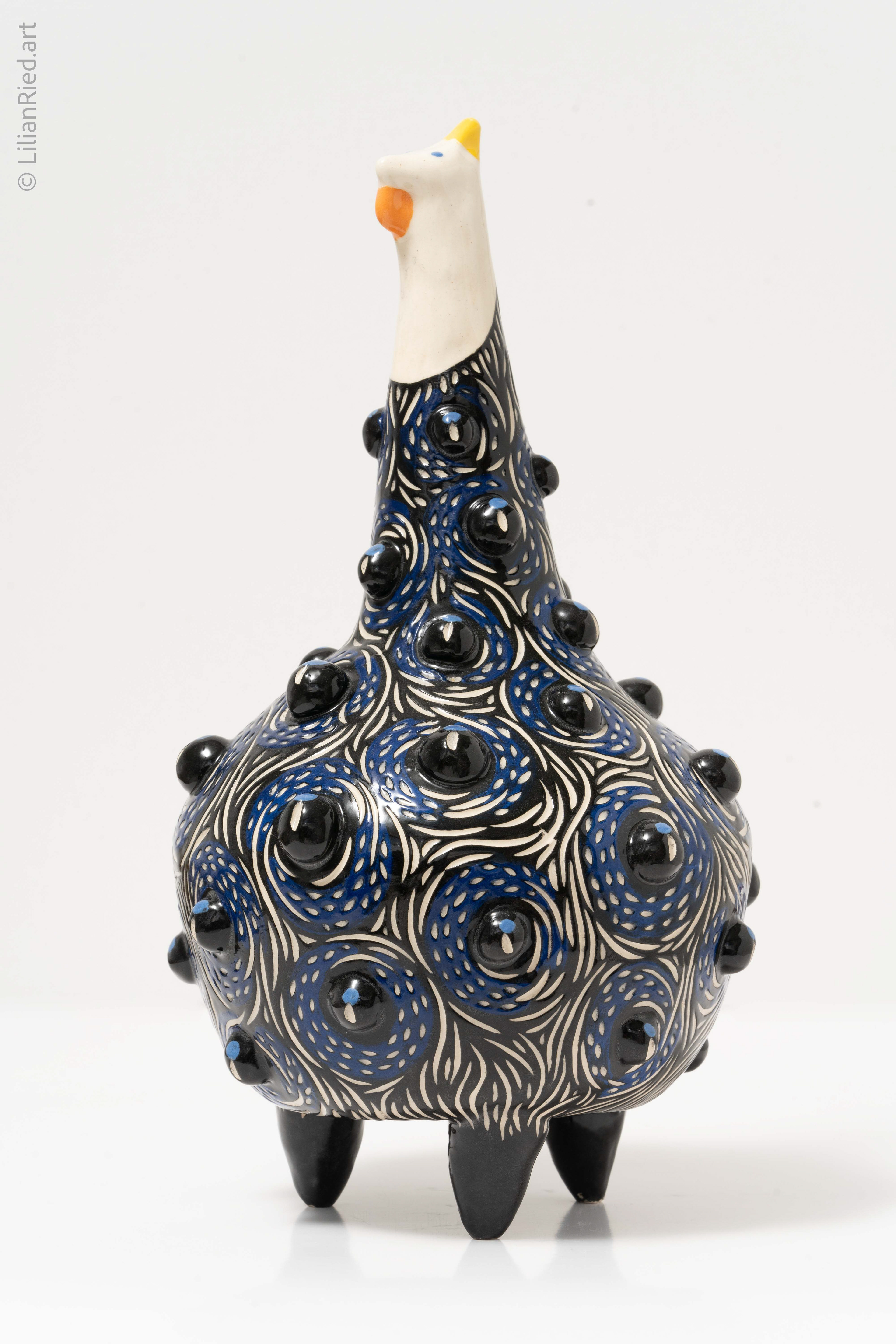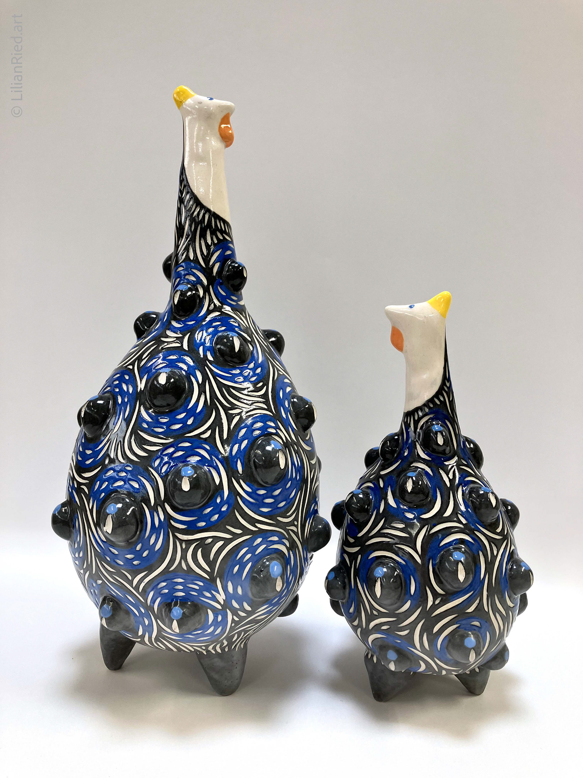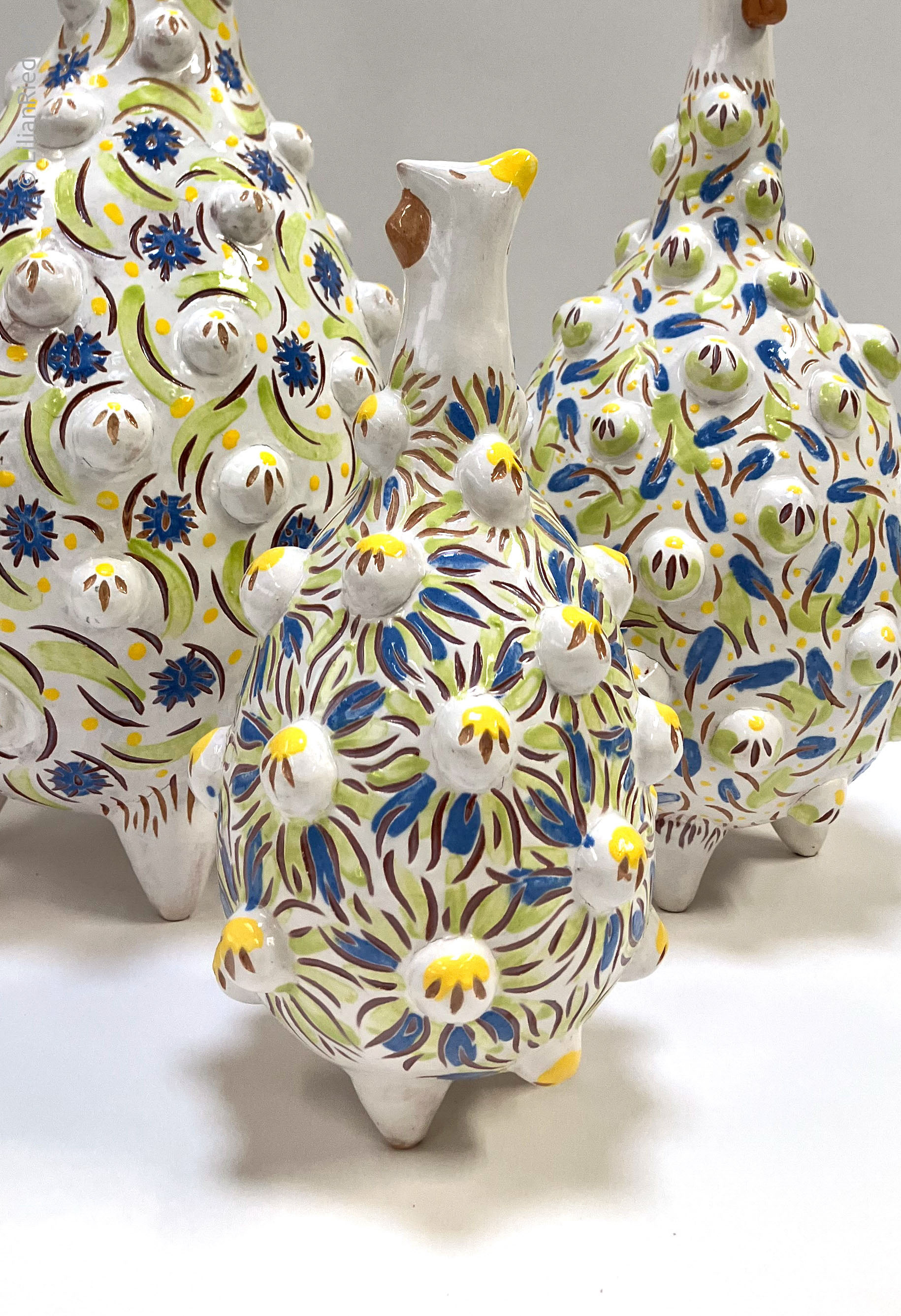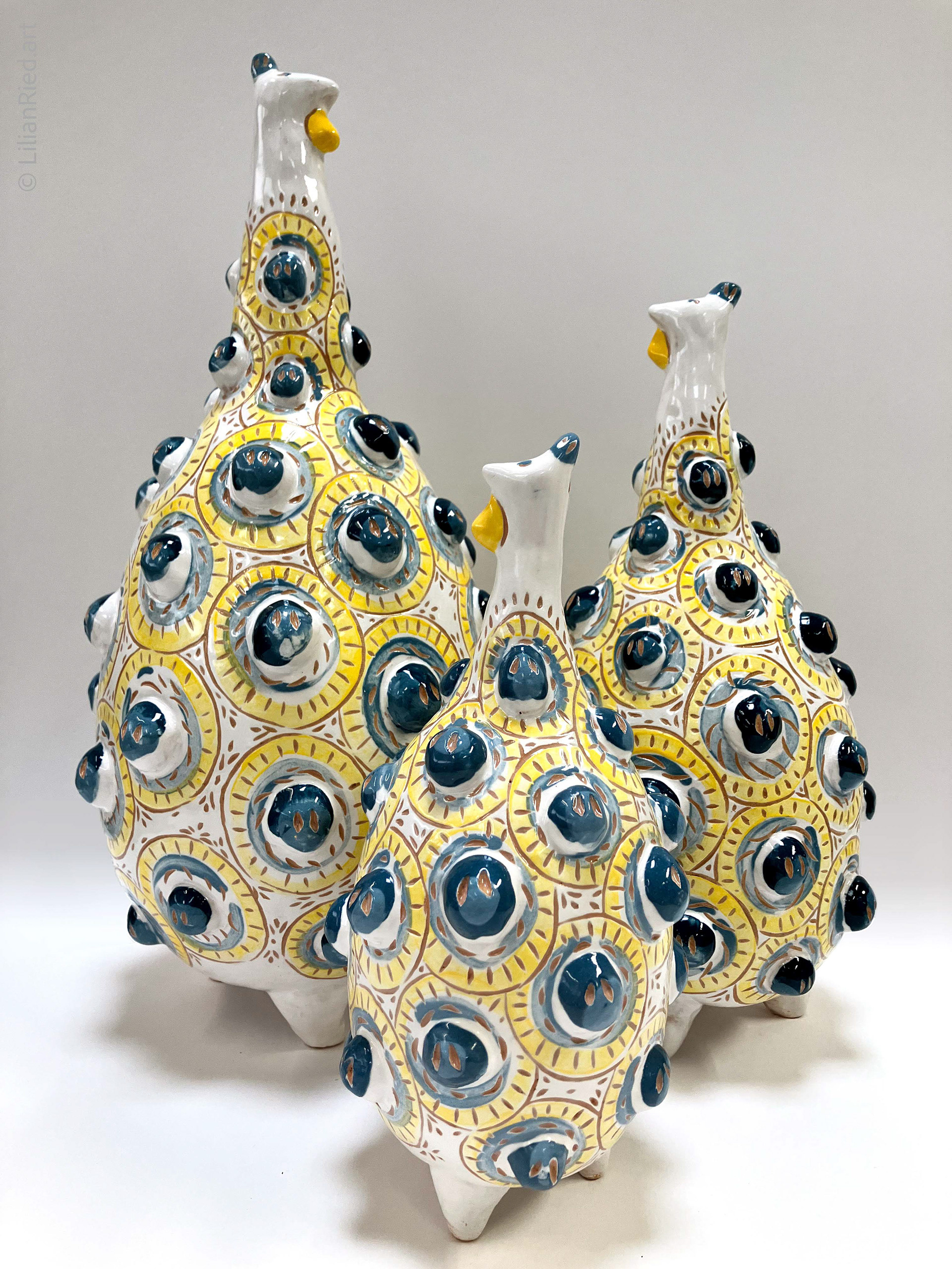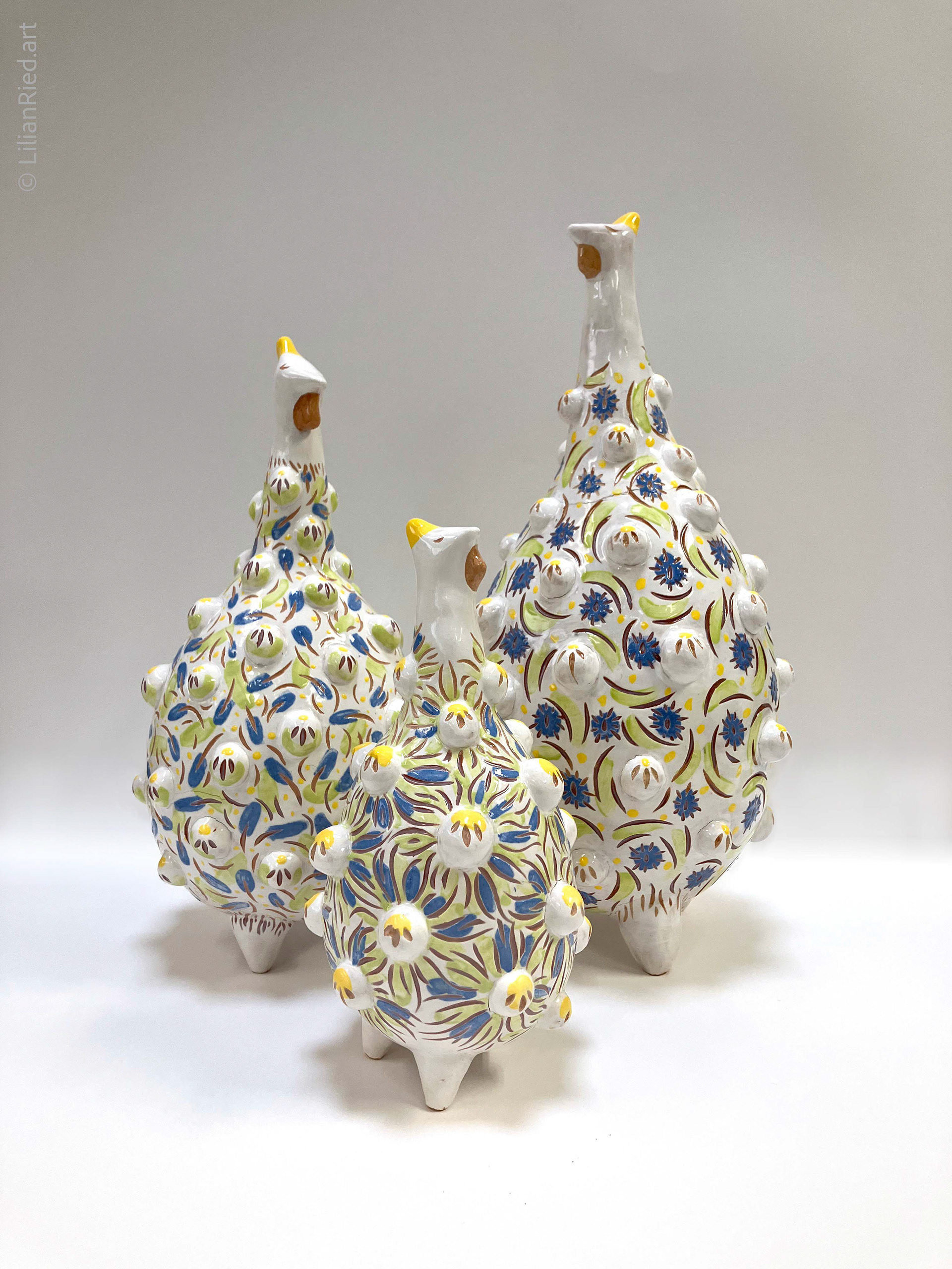 Earthenware sets of 3 Guinea hens recreated in different colors and textures, with sgraffito, underglazes and glaze finishes.
