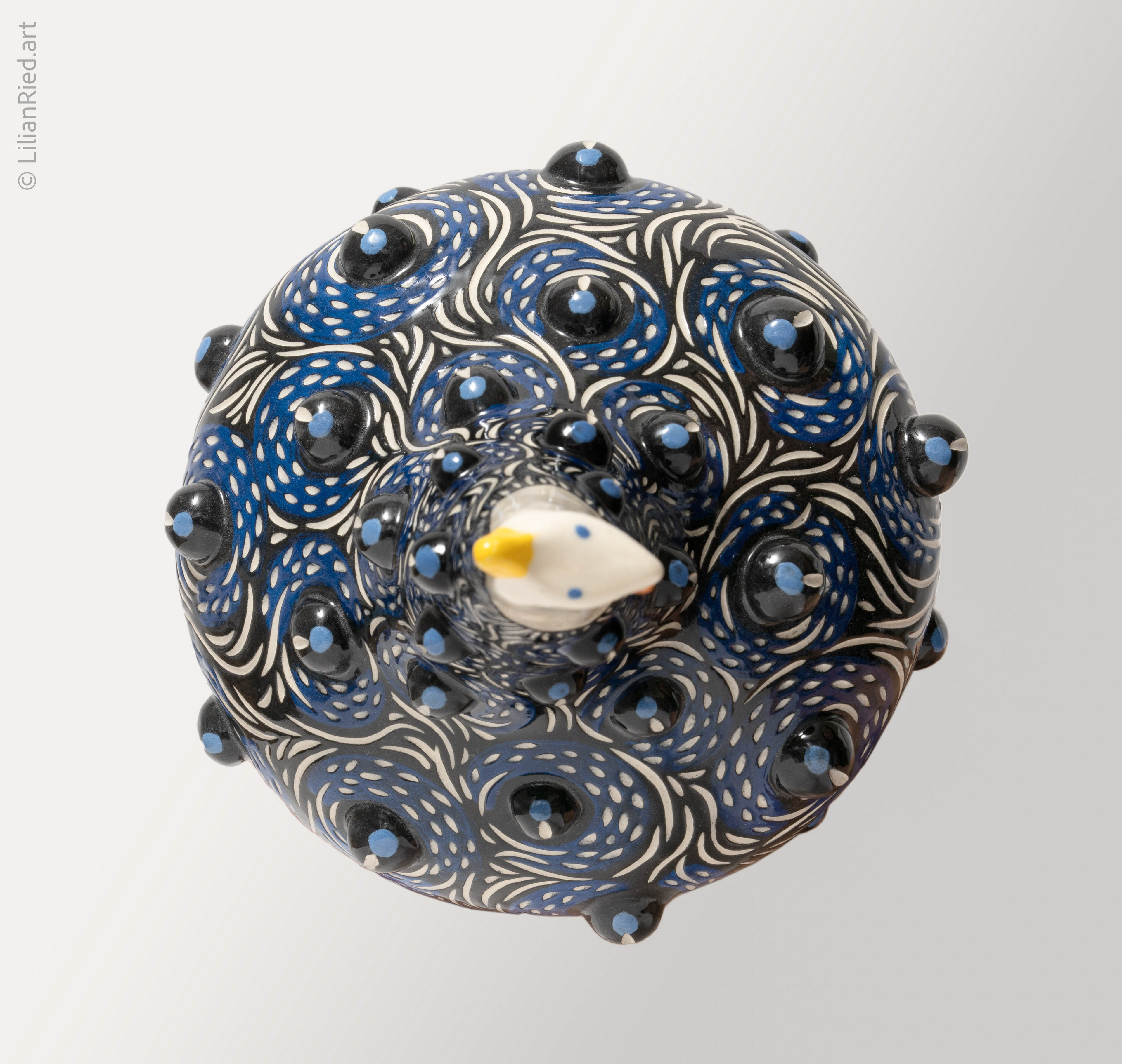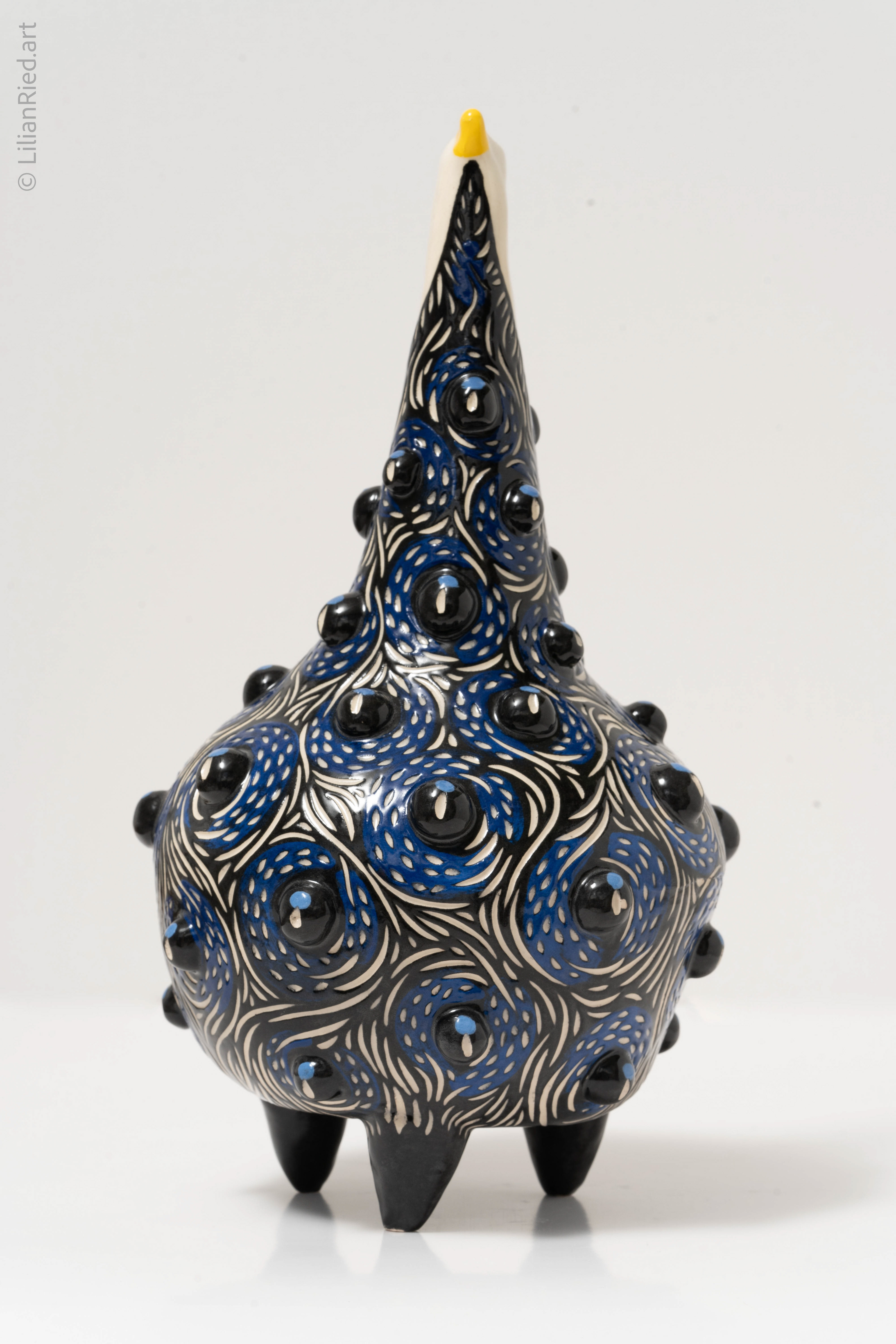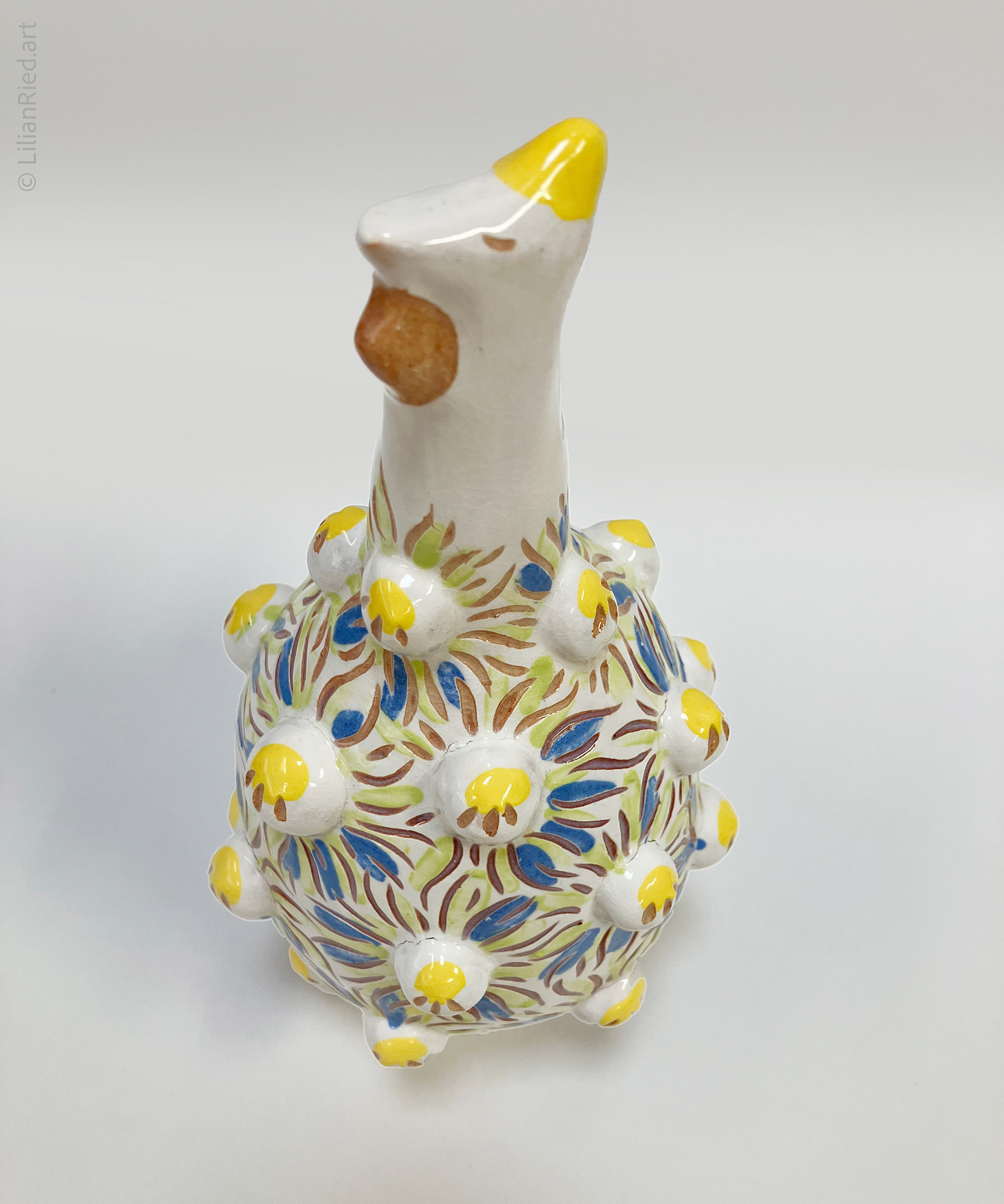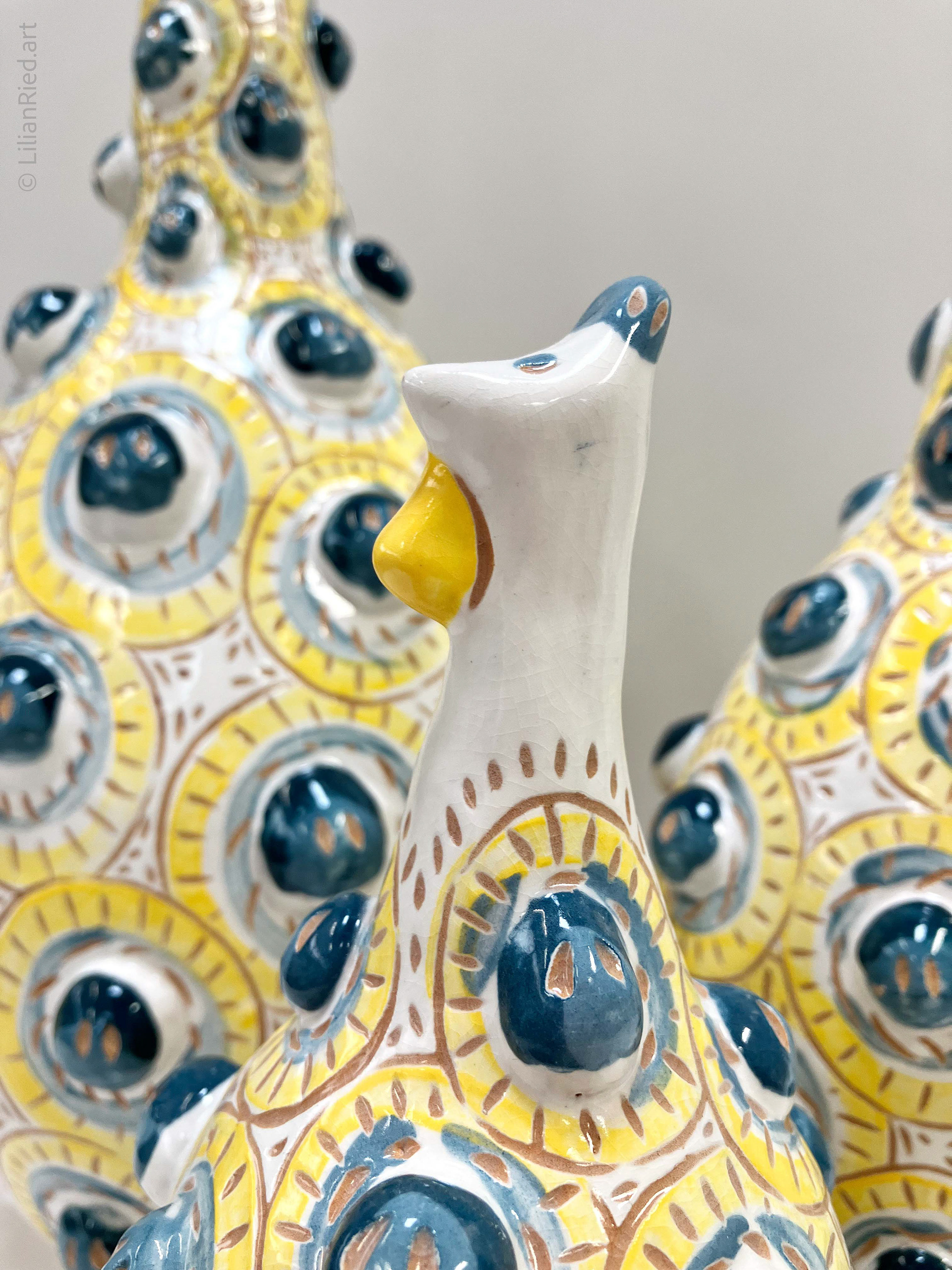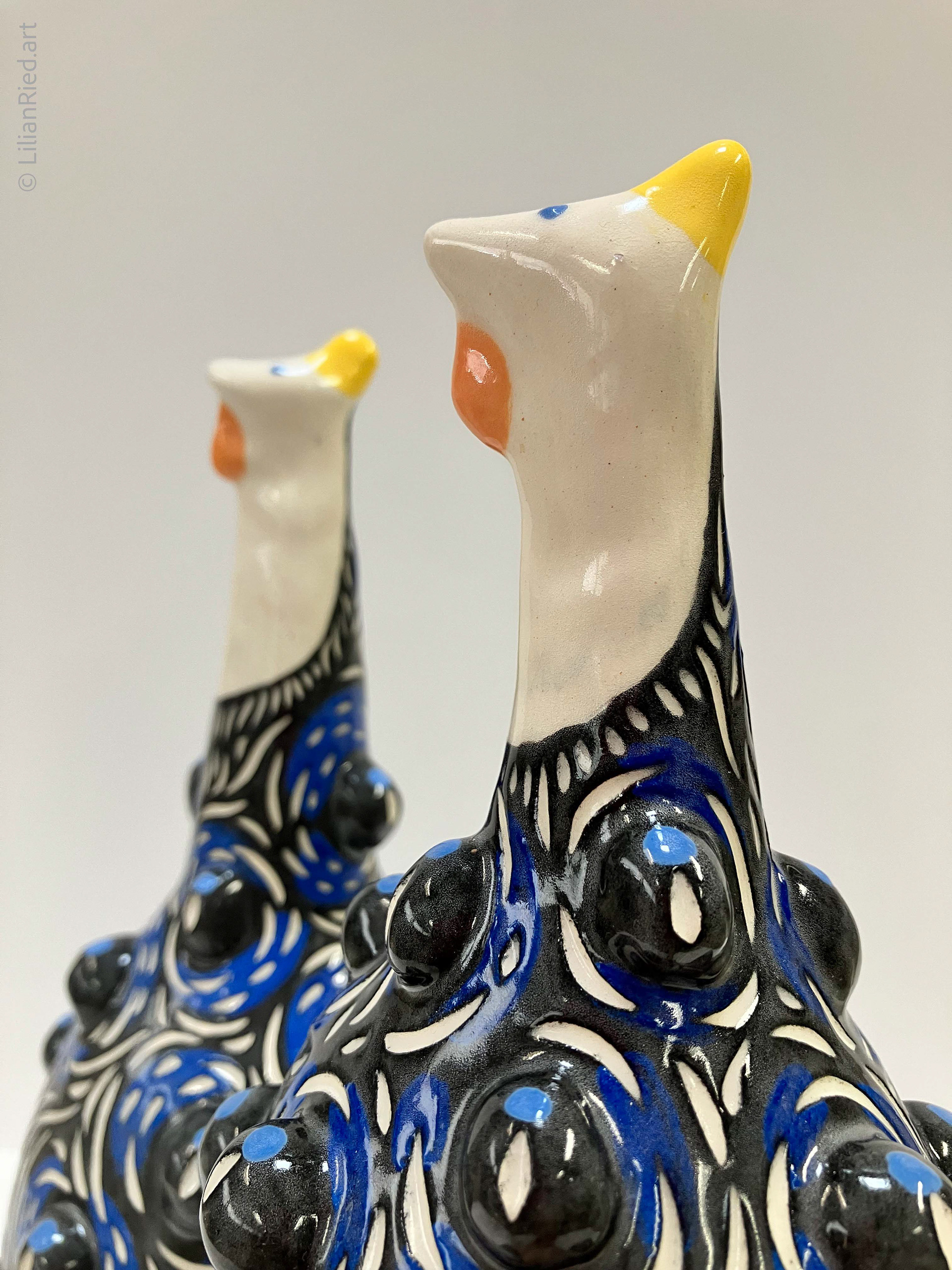 Earthenware sets of 3 Guinea hens recreated in different colors and textures, with sgraffito, underglazes and glaze finishes.