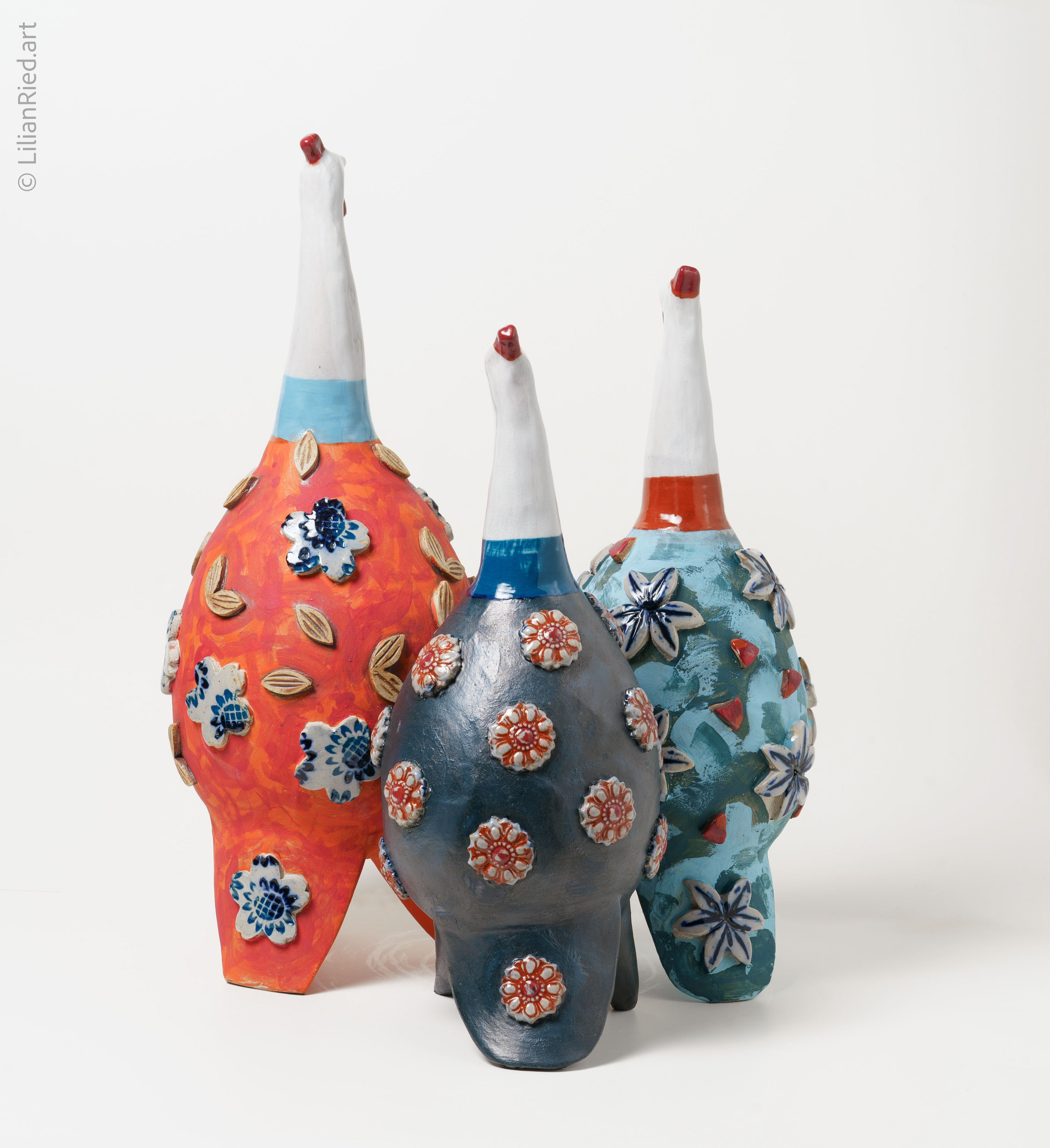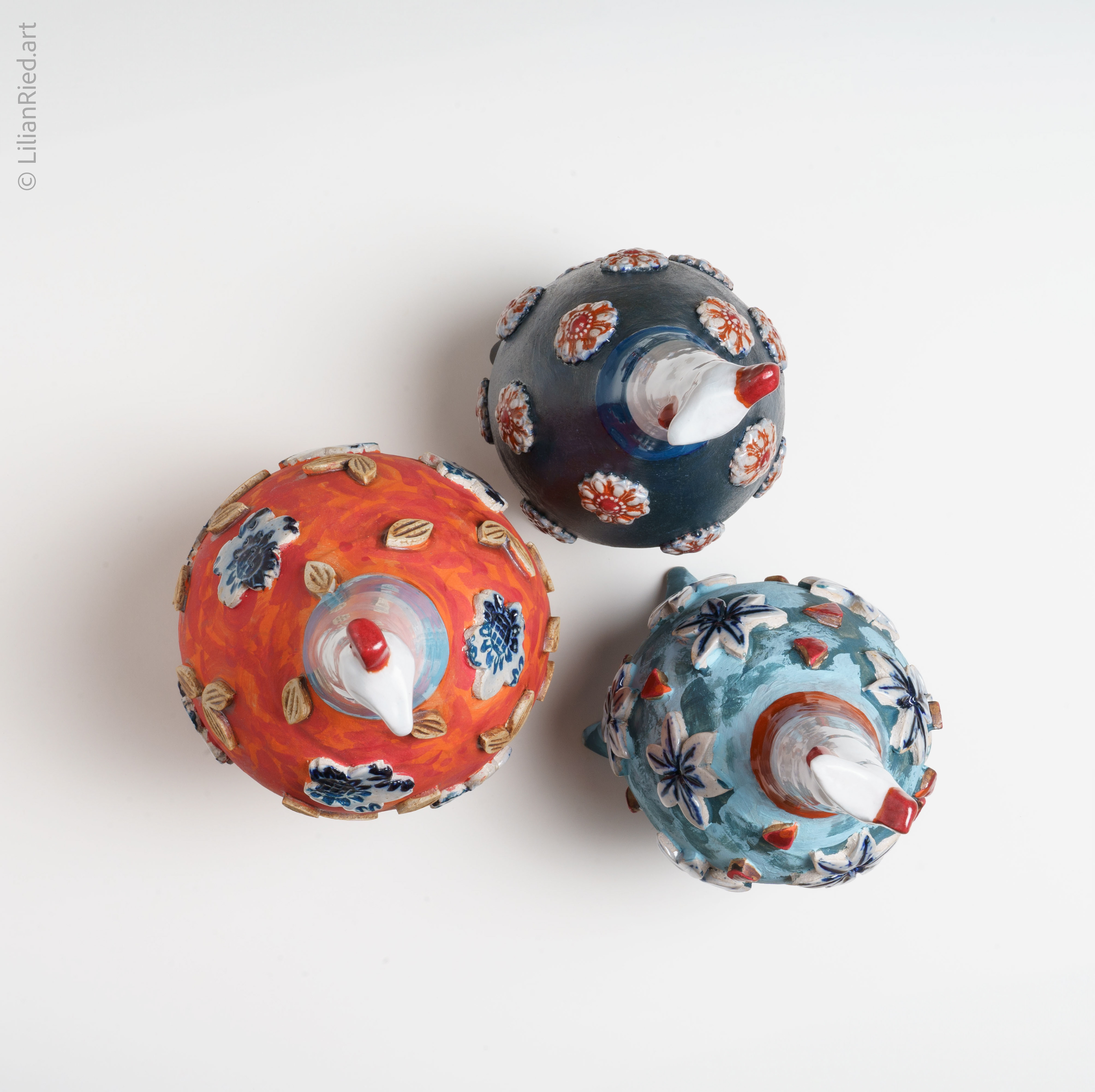Stoneware set of 3 pieces with sprigging, underglaze and glaze finishes.