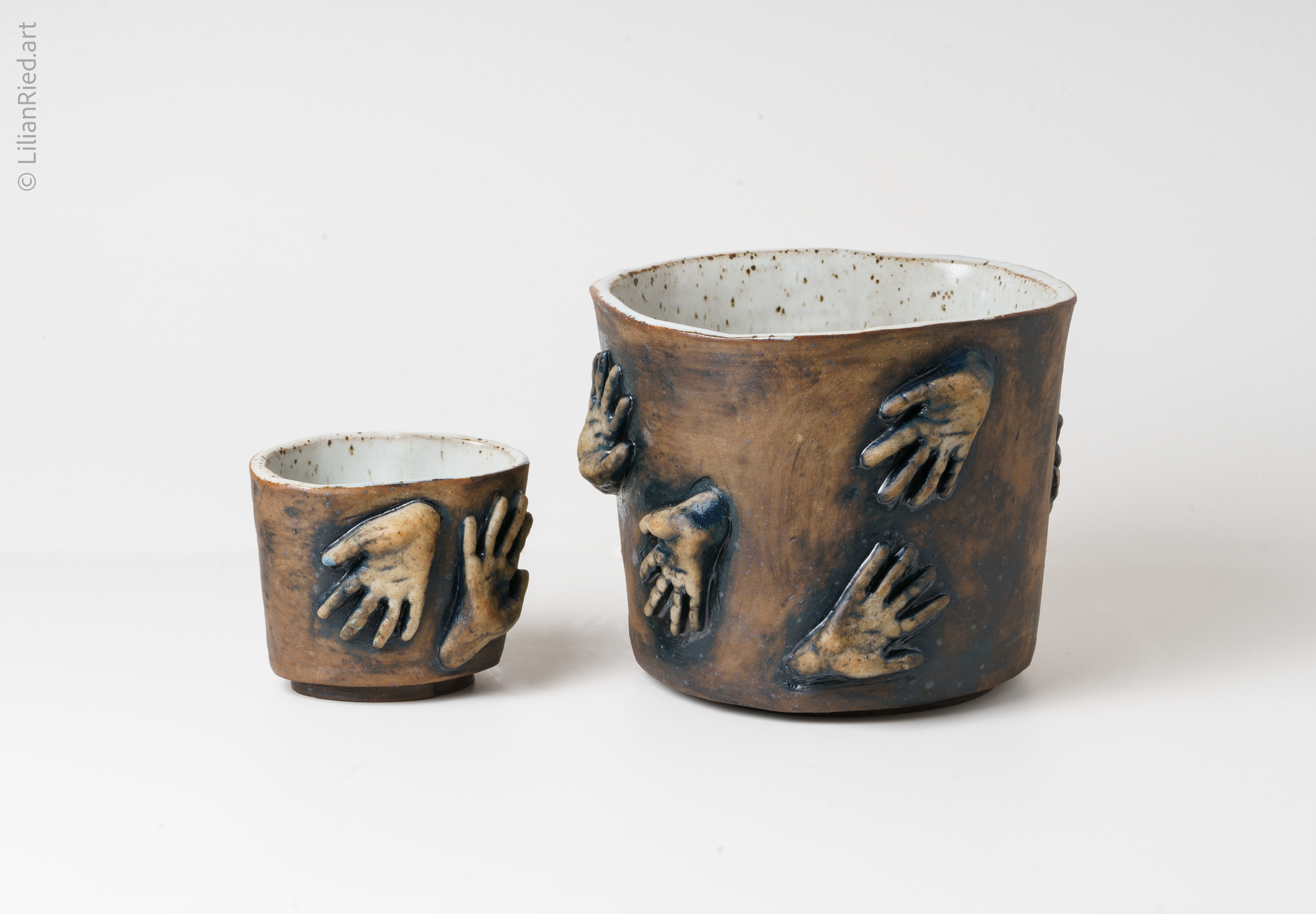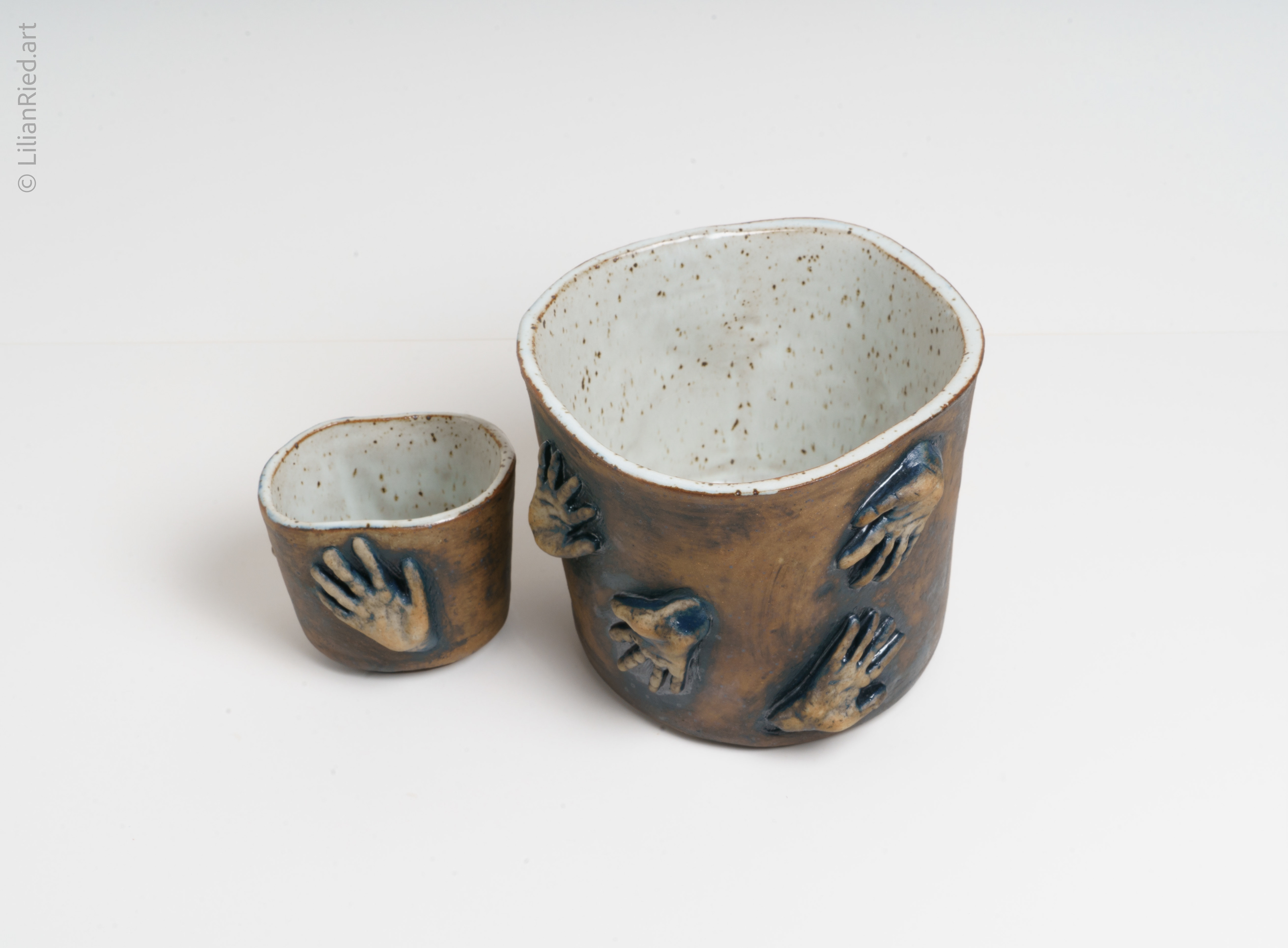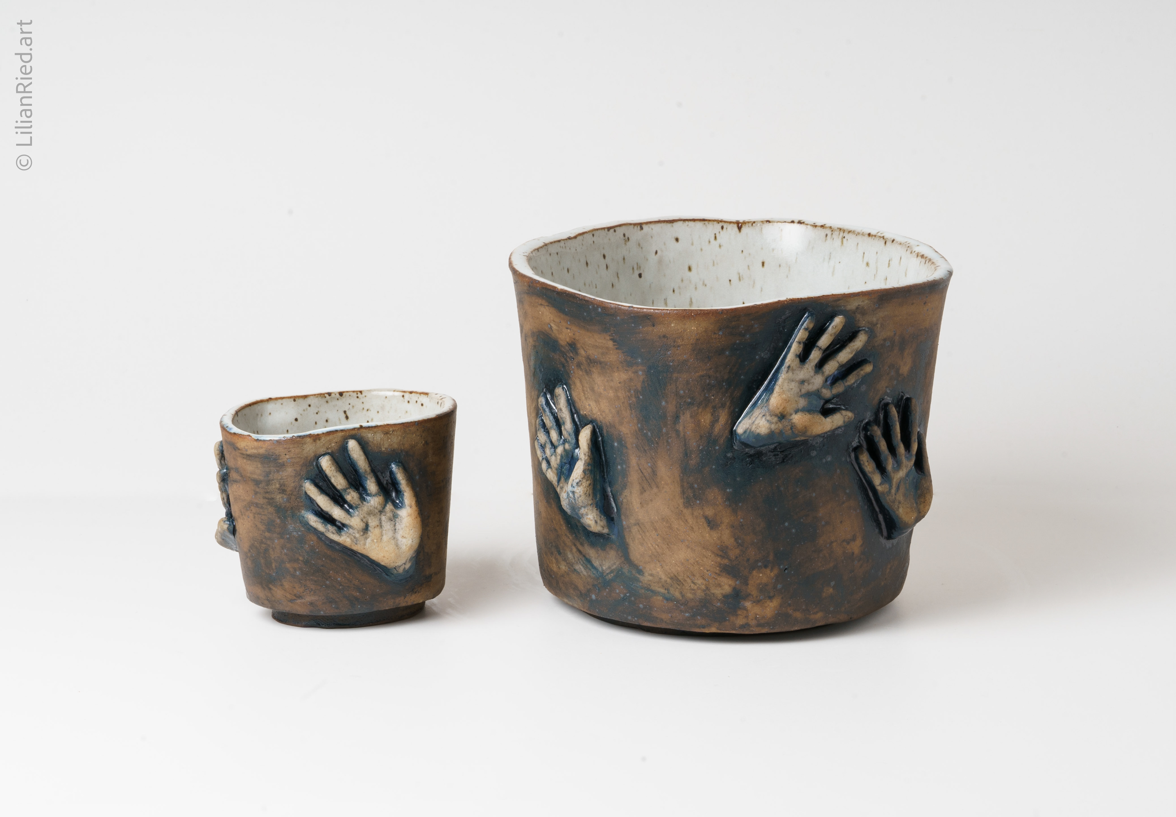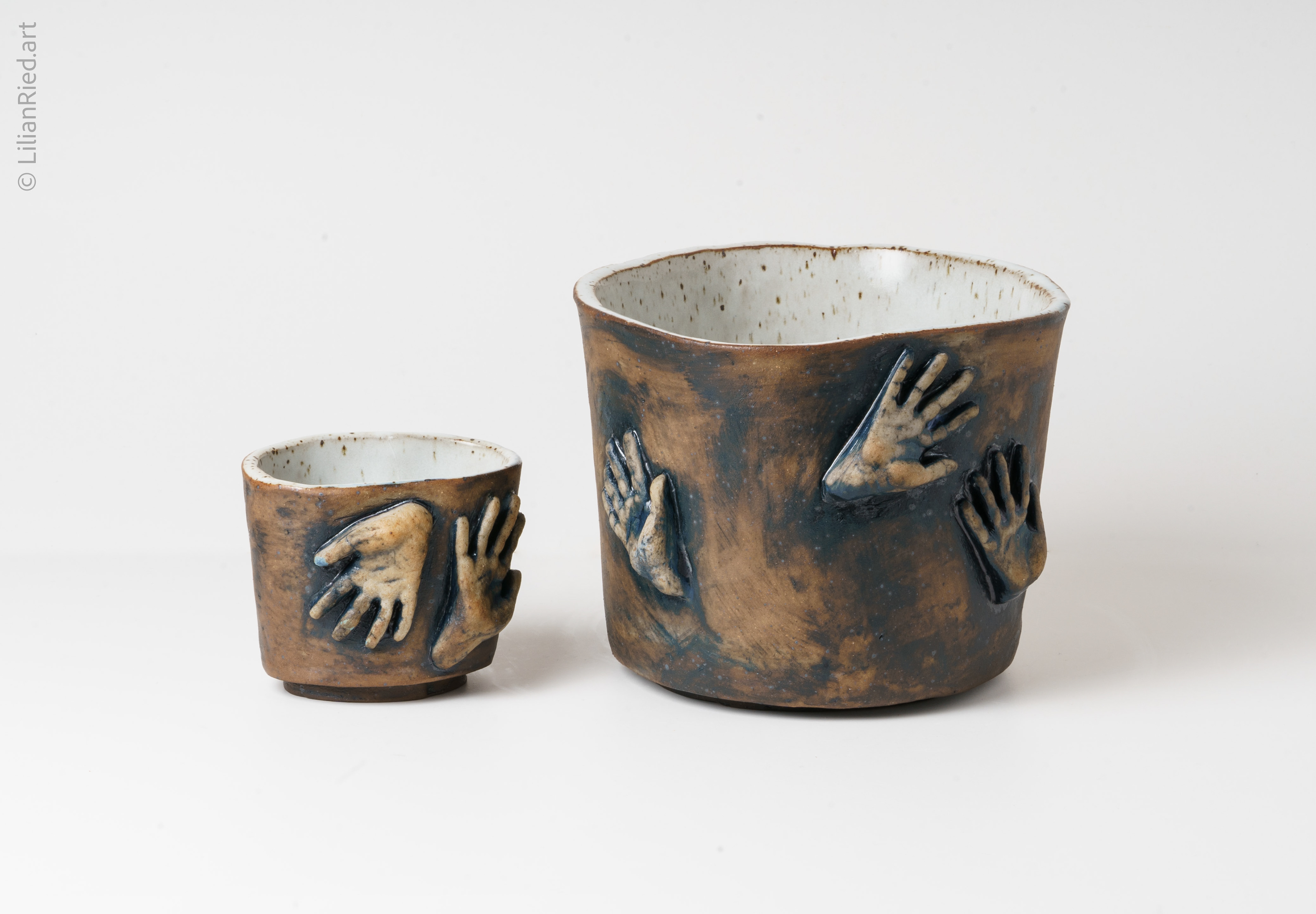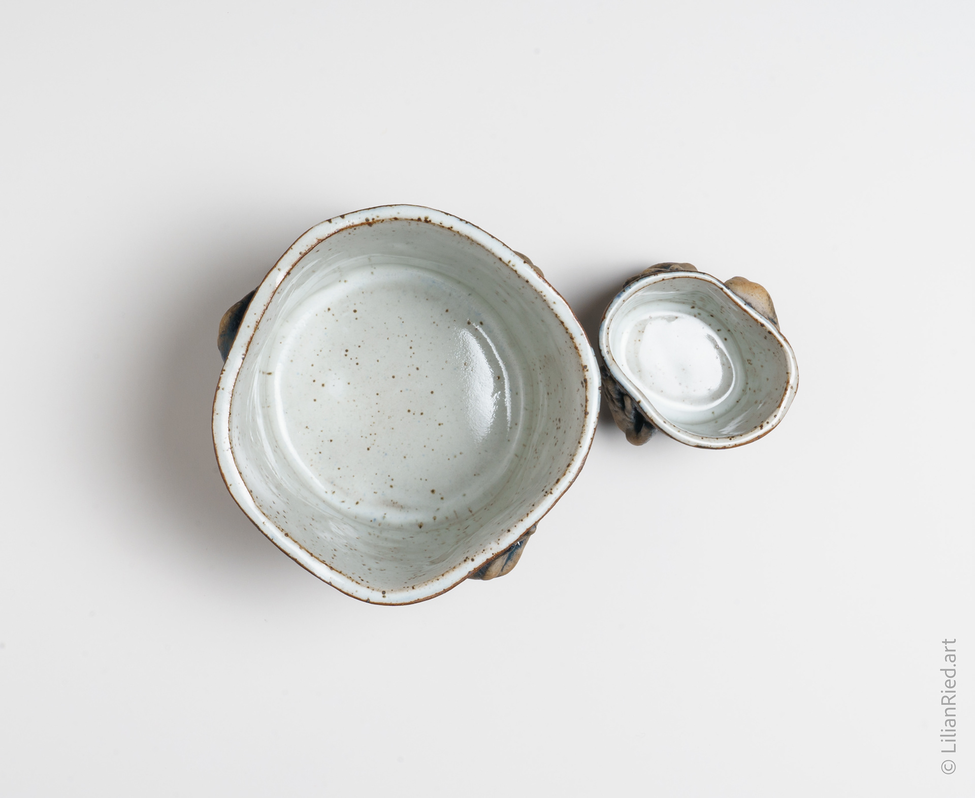 Stoneware set of 2 pieces with sprigging, washes and glaze finishes.