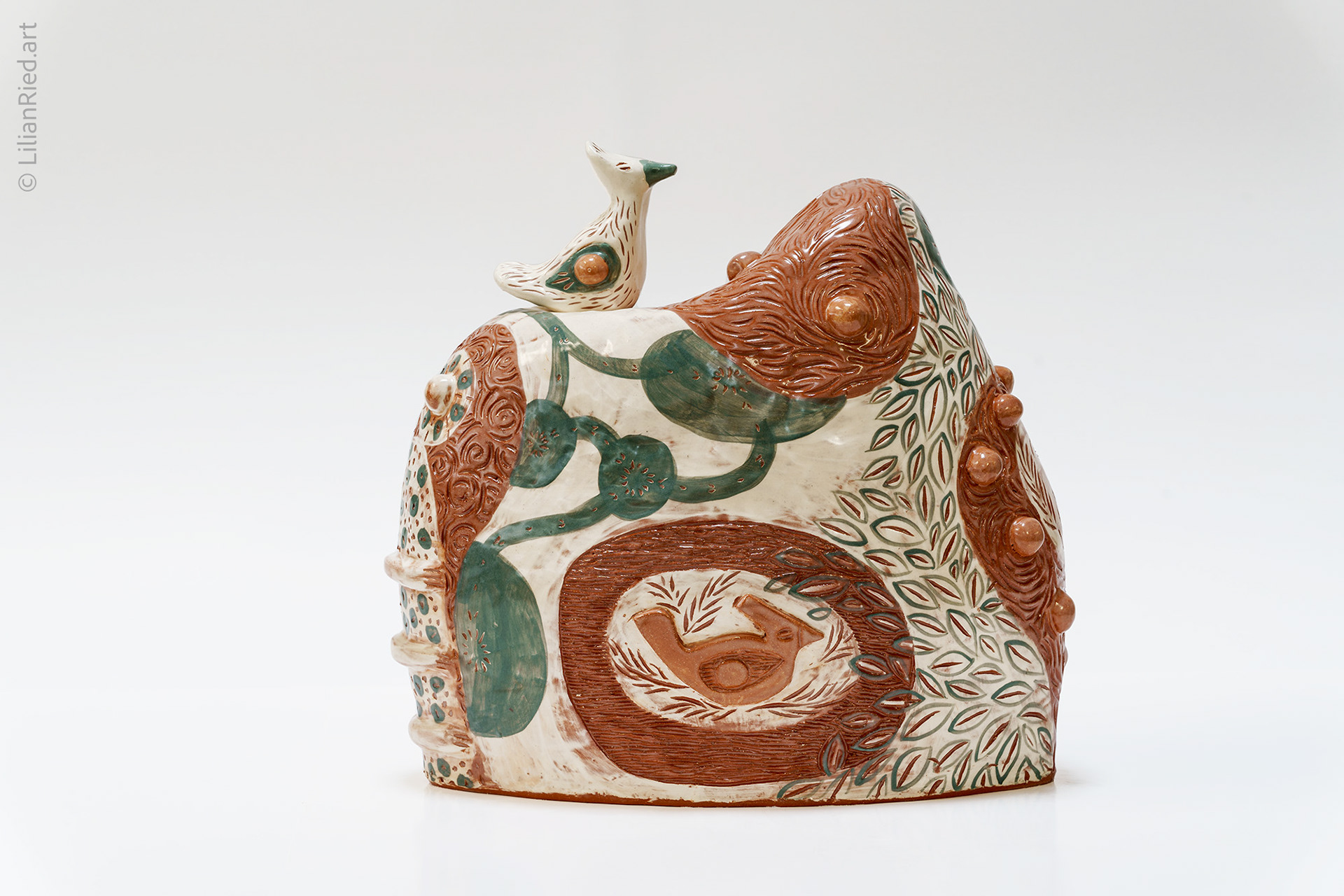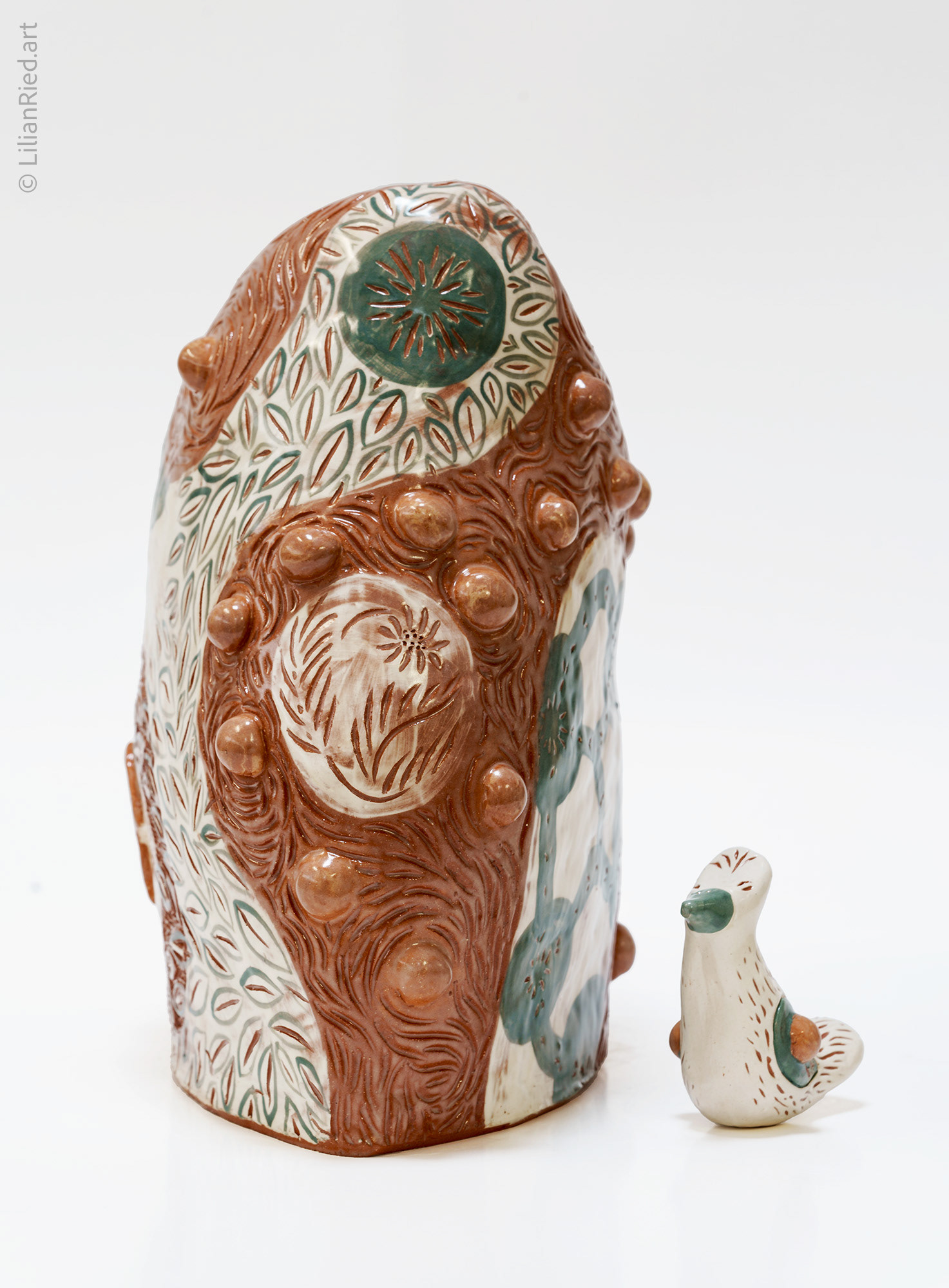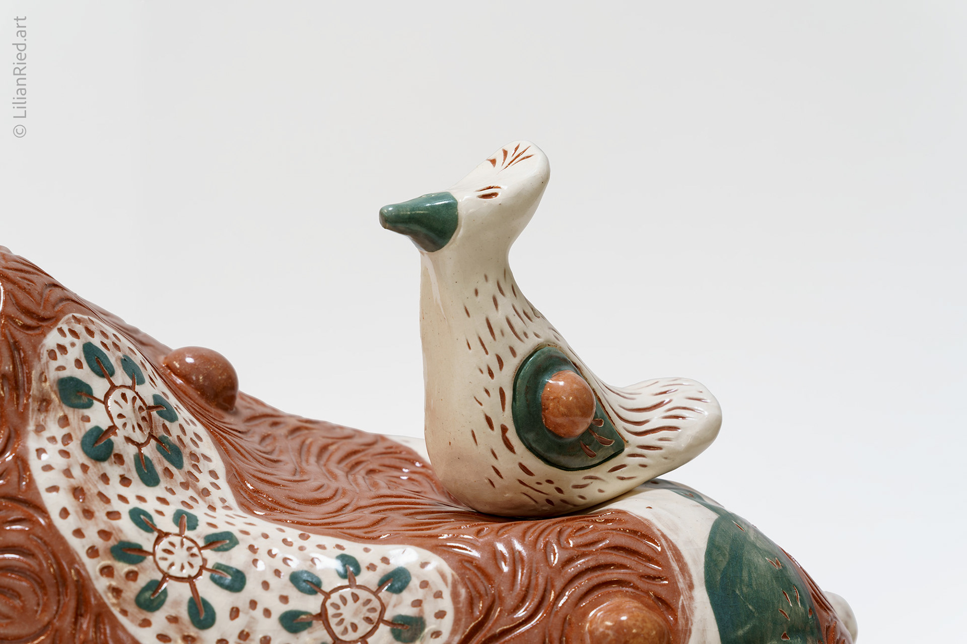 Earthenware set of 2 pieces with sgraffito and glaze finishes. The ludic composition of the sculpture allows interaction as we move the bird, exploring different postures.