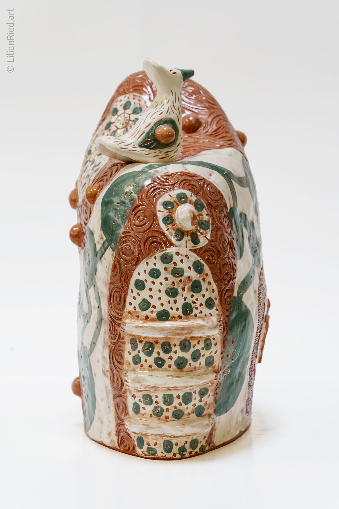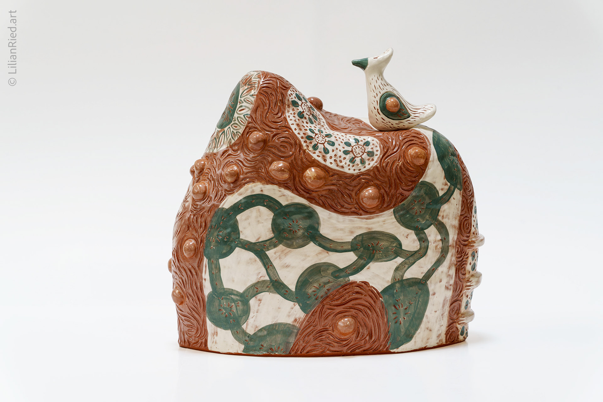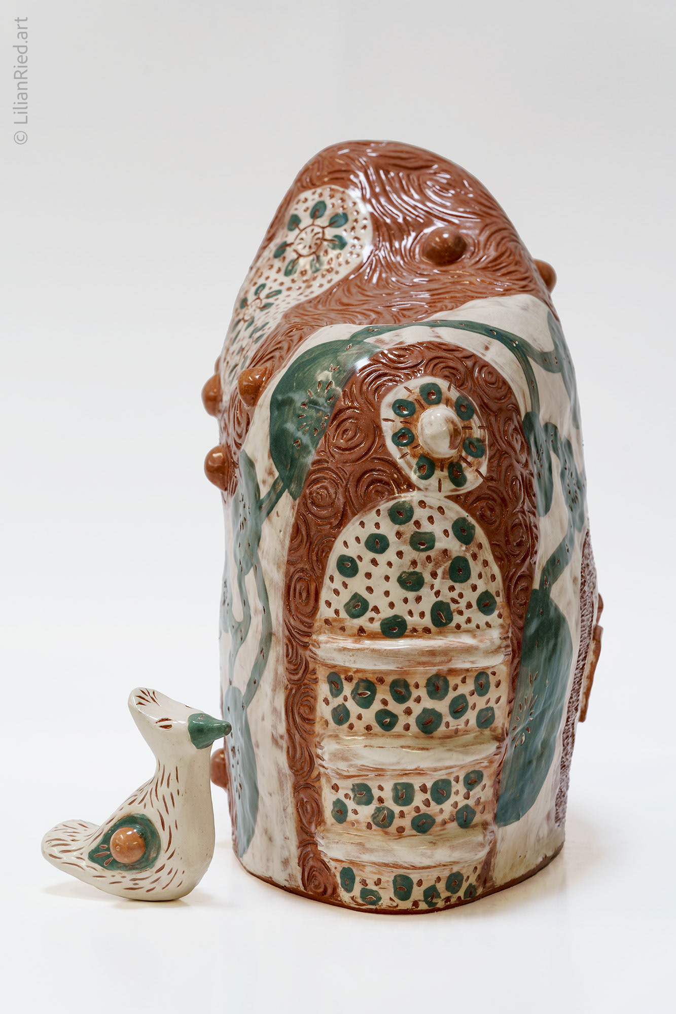 Earthenware set of 2 pieces with sgraffito and glaze finishes. The ludic composition of the sculpture allows interaction as we move the bird, exploring different postures.