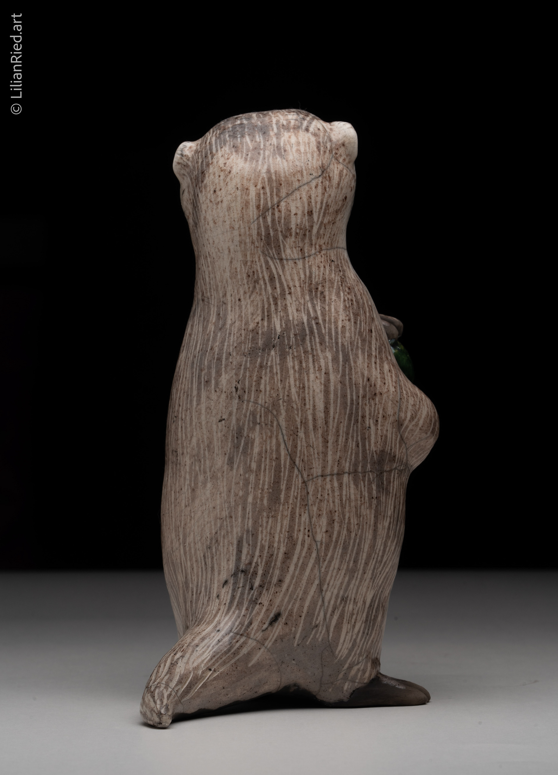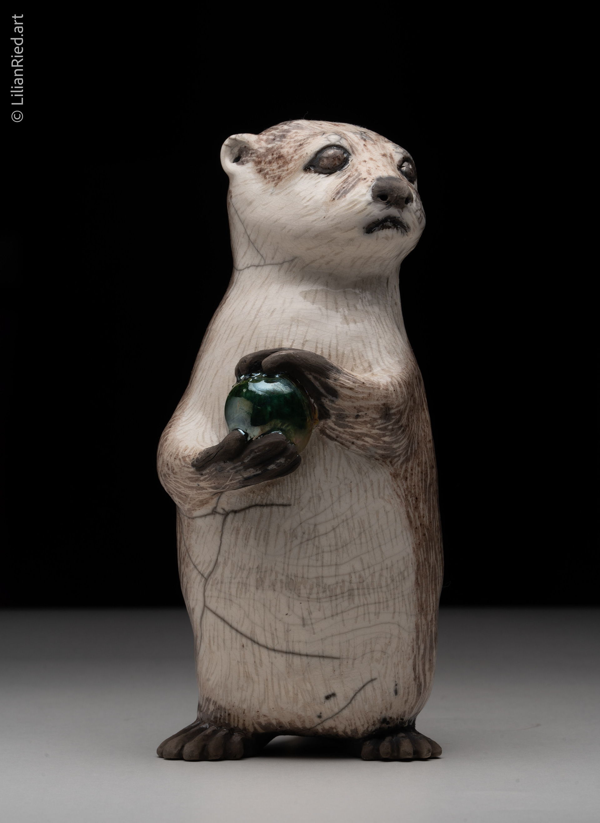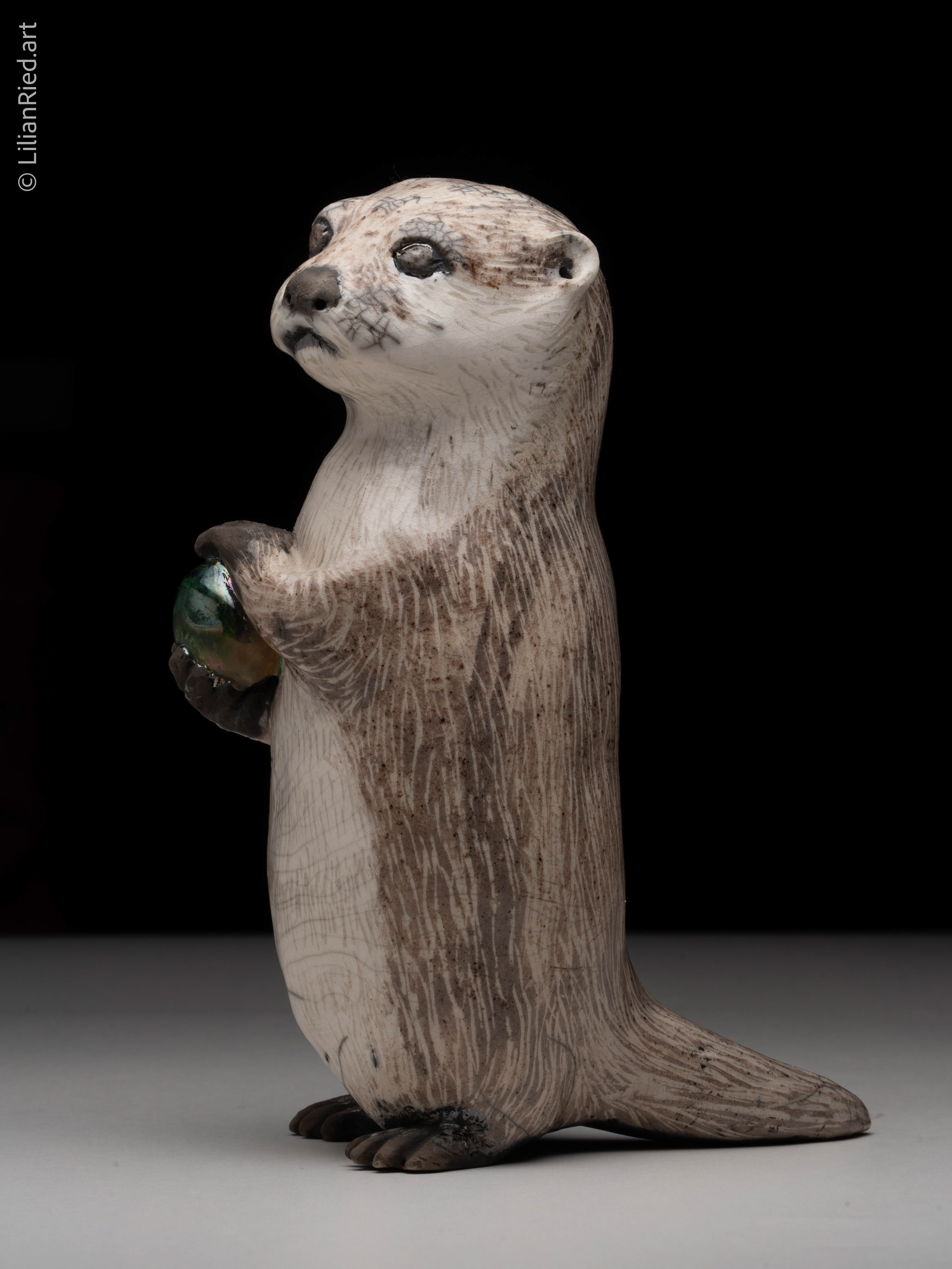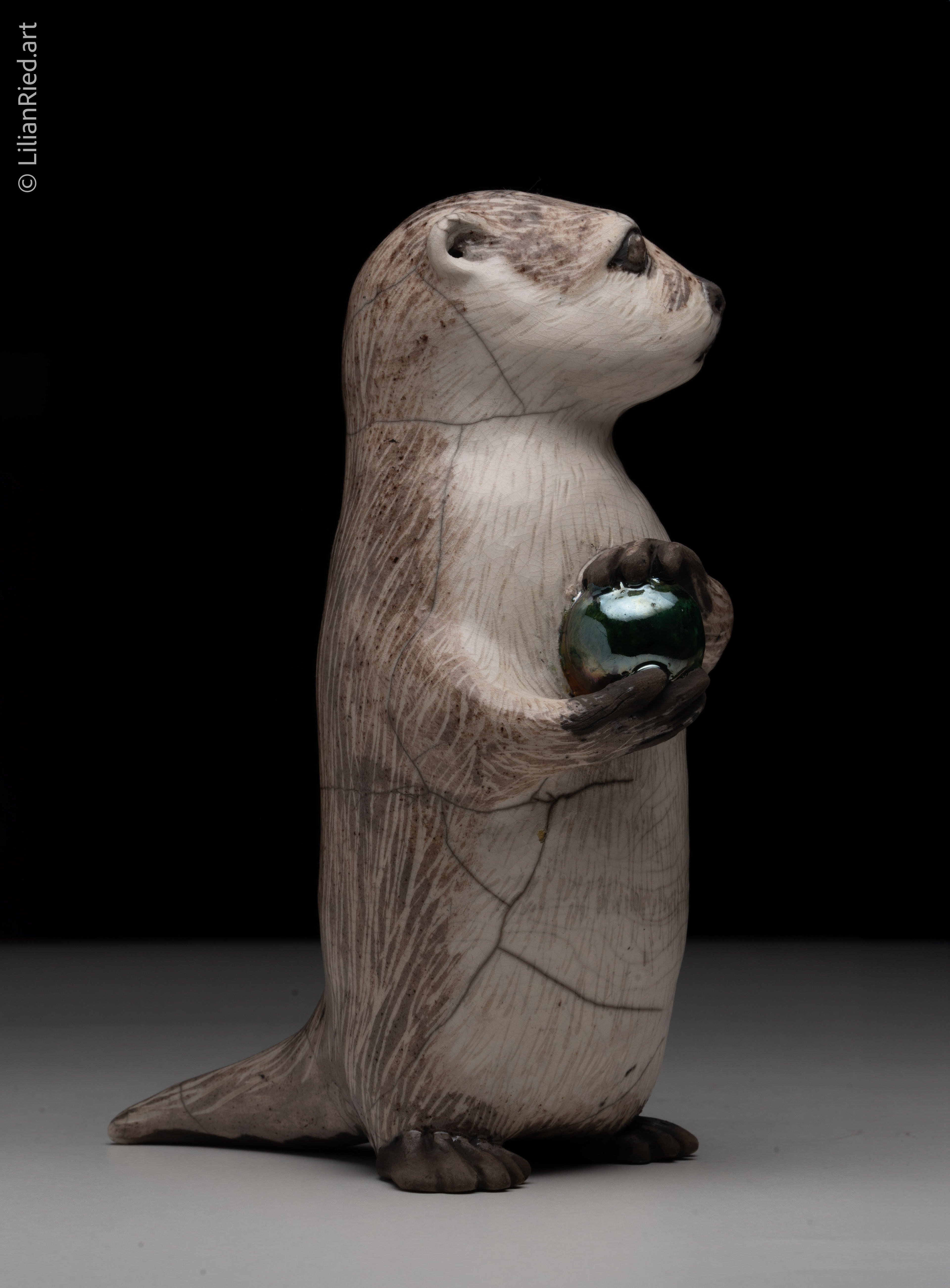 Raku fired earthenware showing an otter holding a precious ball.