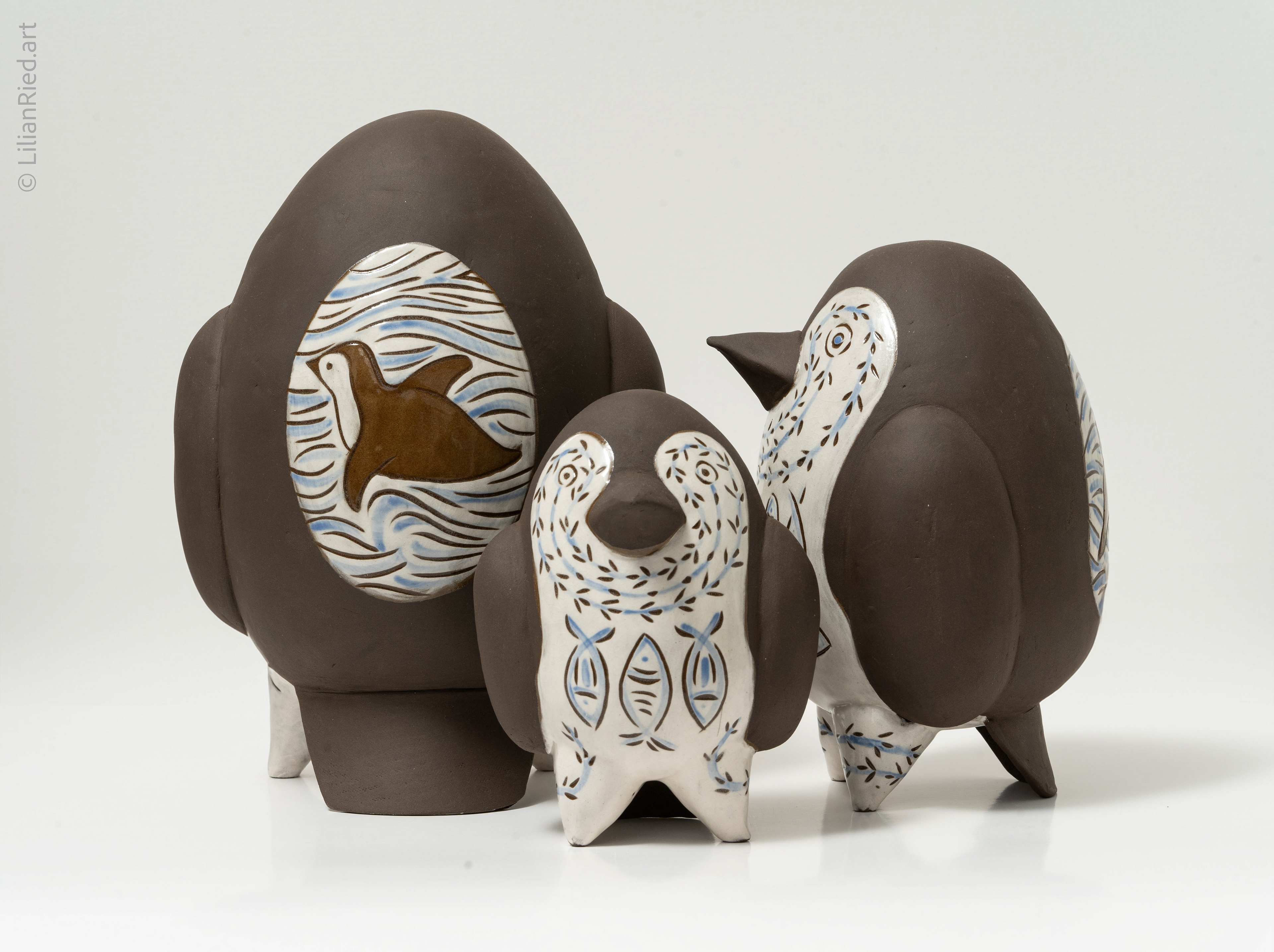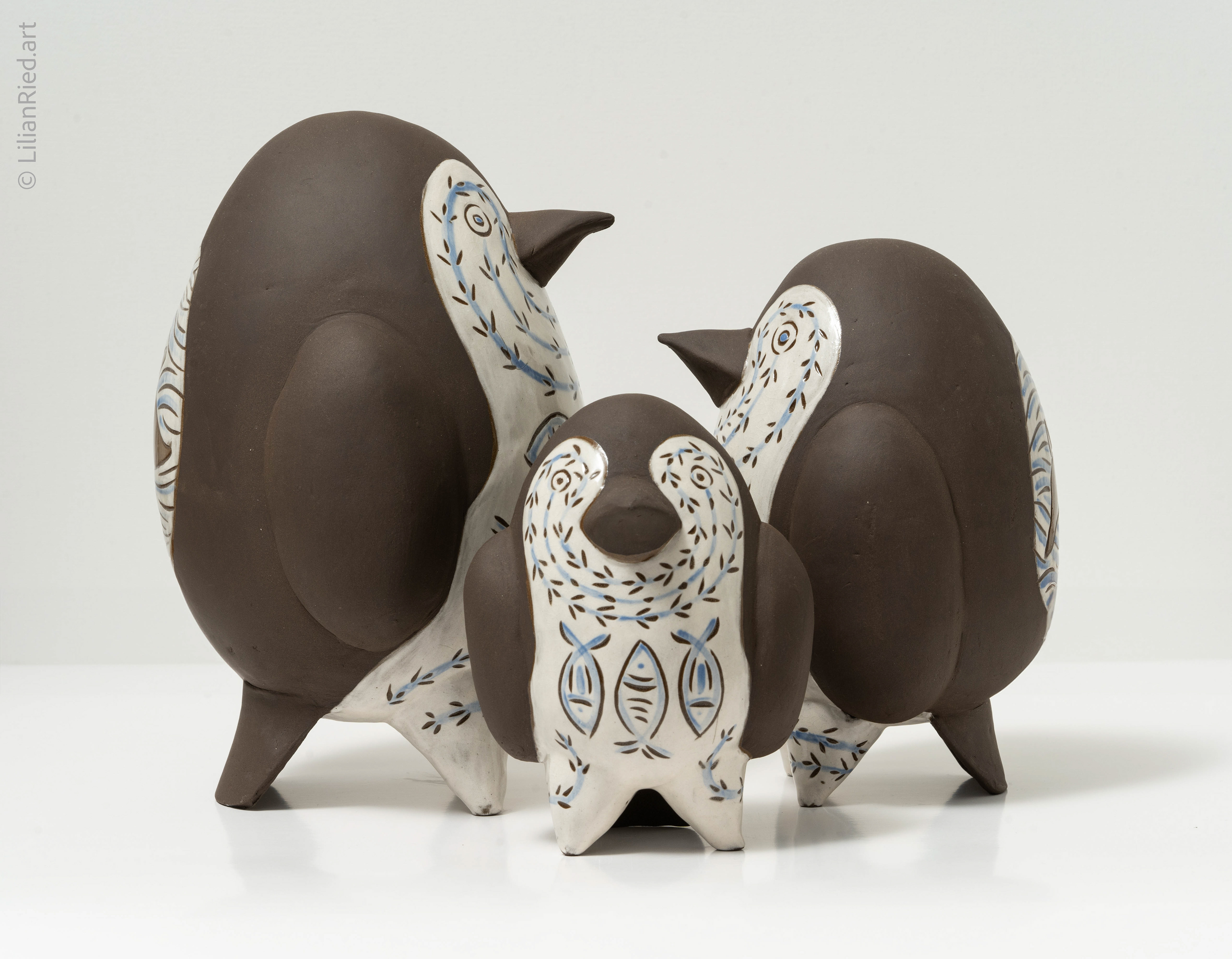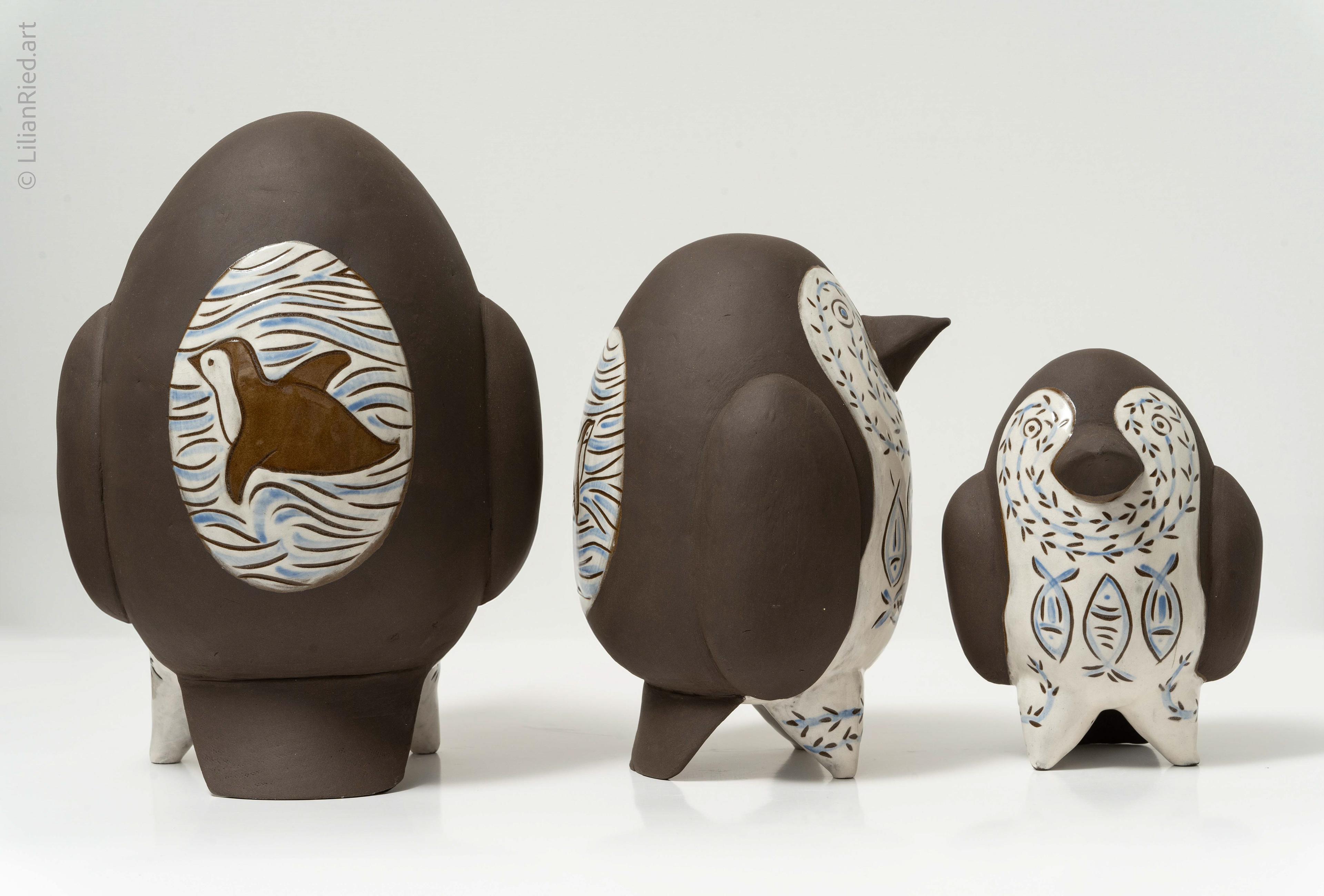 Dark stoneware set of 3 composite pieces, with sgraffito and glaze finishes. The penguins are linked to each other by their shape and body impressions. The surface design is a visual discourse of their living involving food, environment and behavior.