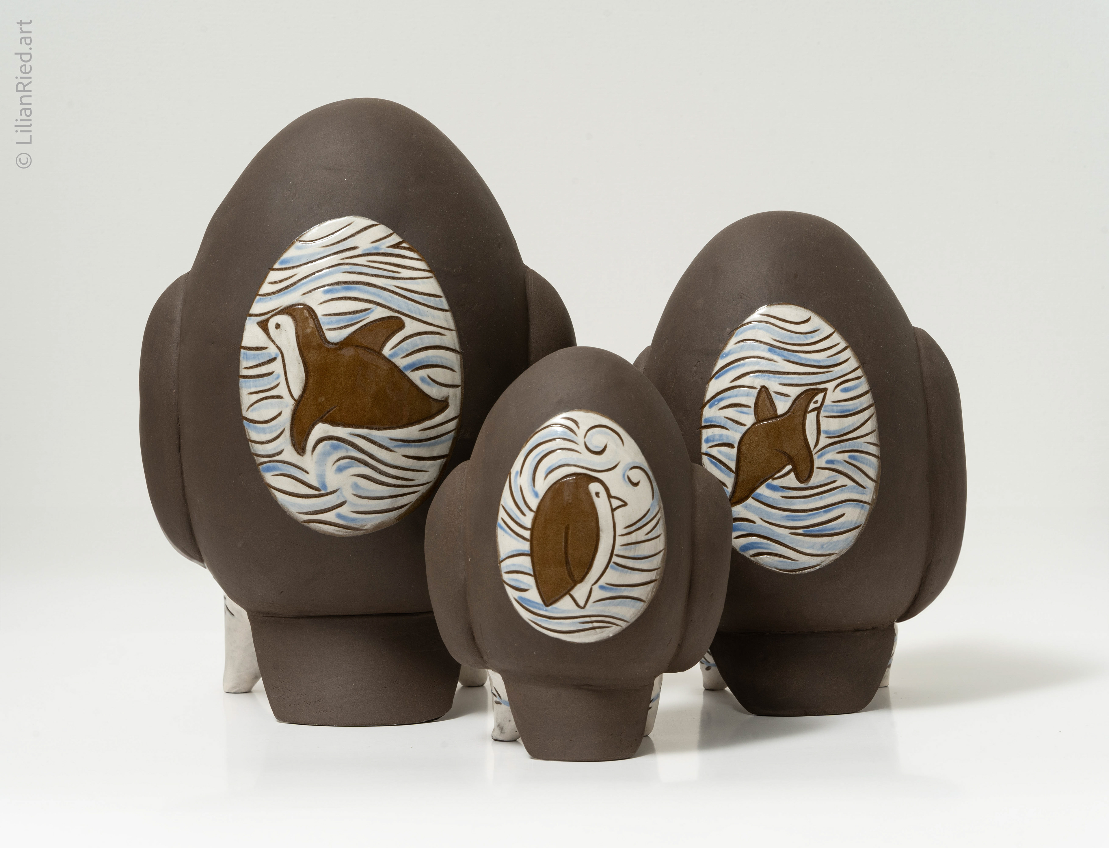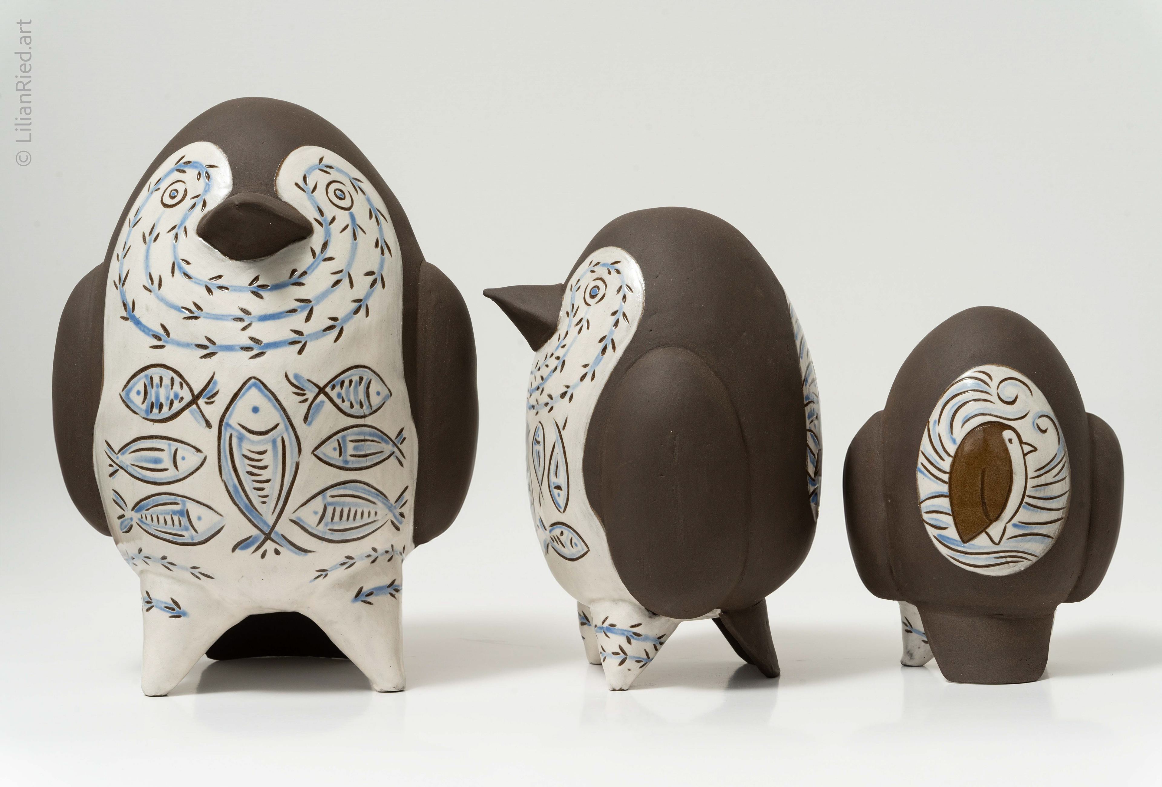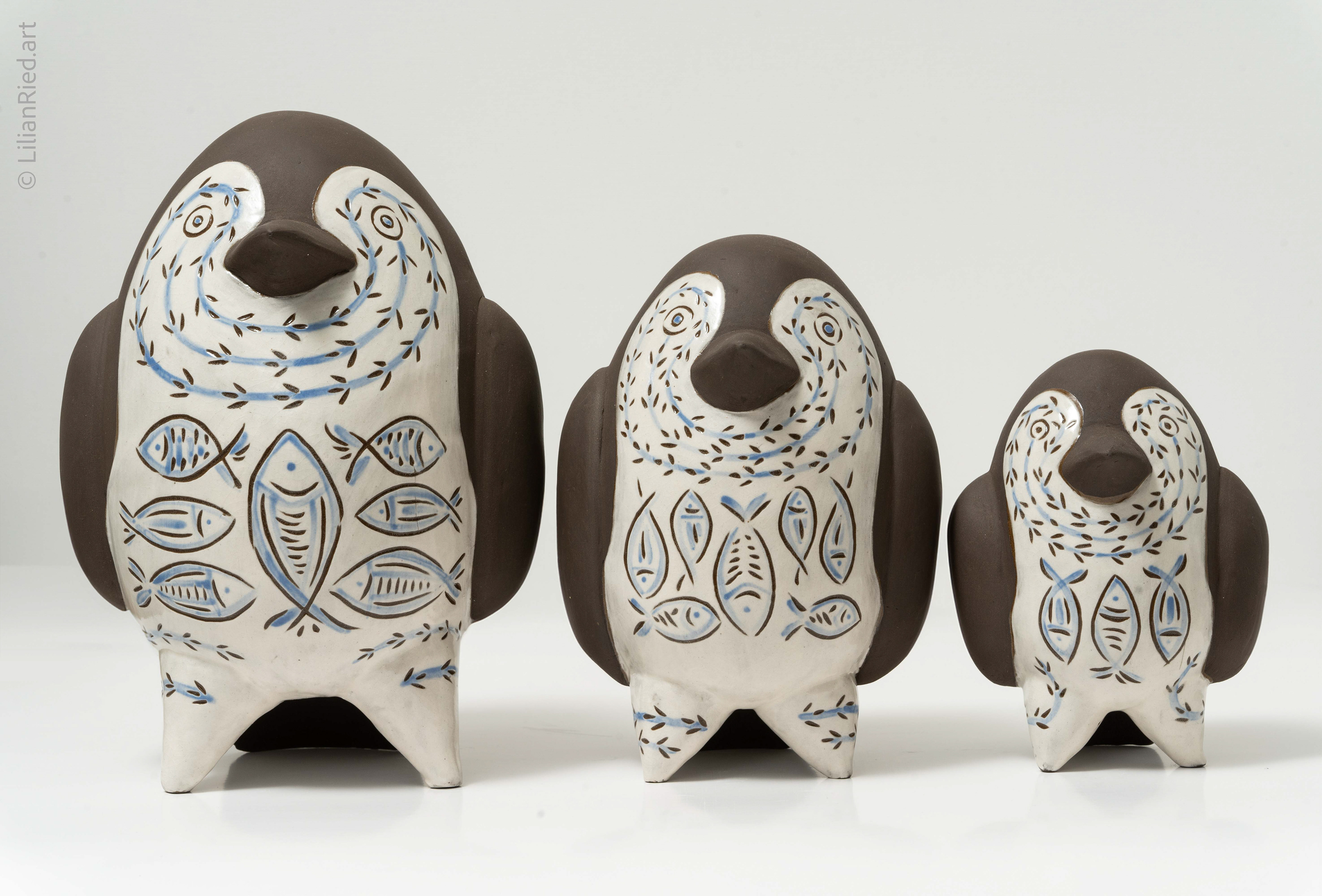 Dark stoneware set of 3 composite pieces, with sgraffito and glaze finishes. The penguins are linked to each other by their shape and body impressions. The surface design is a visual discourse of their living involving food, environment and behavior.