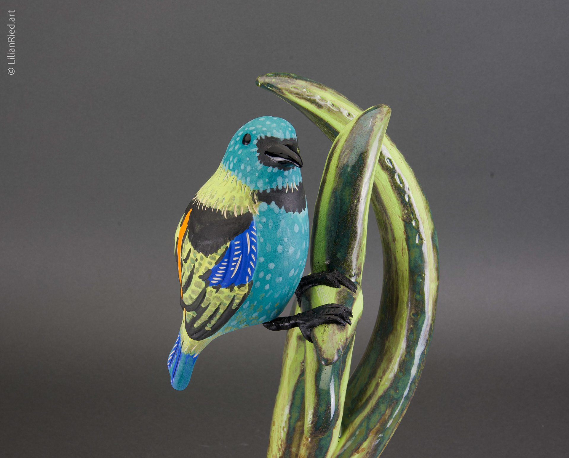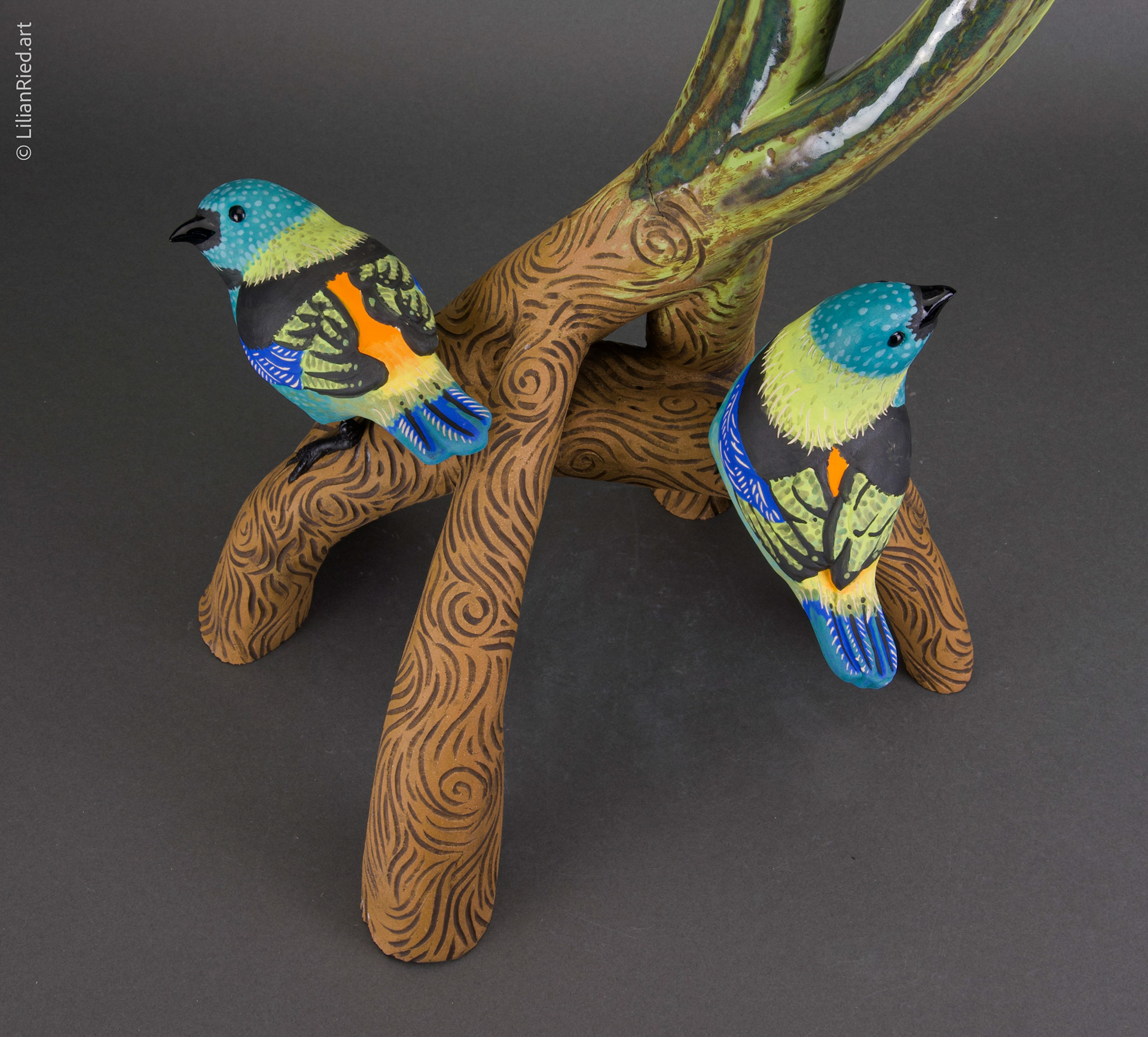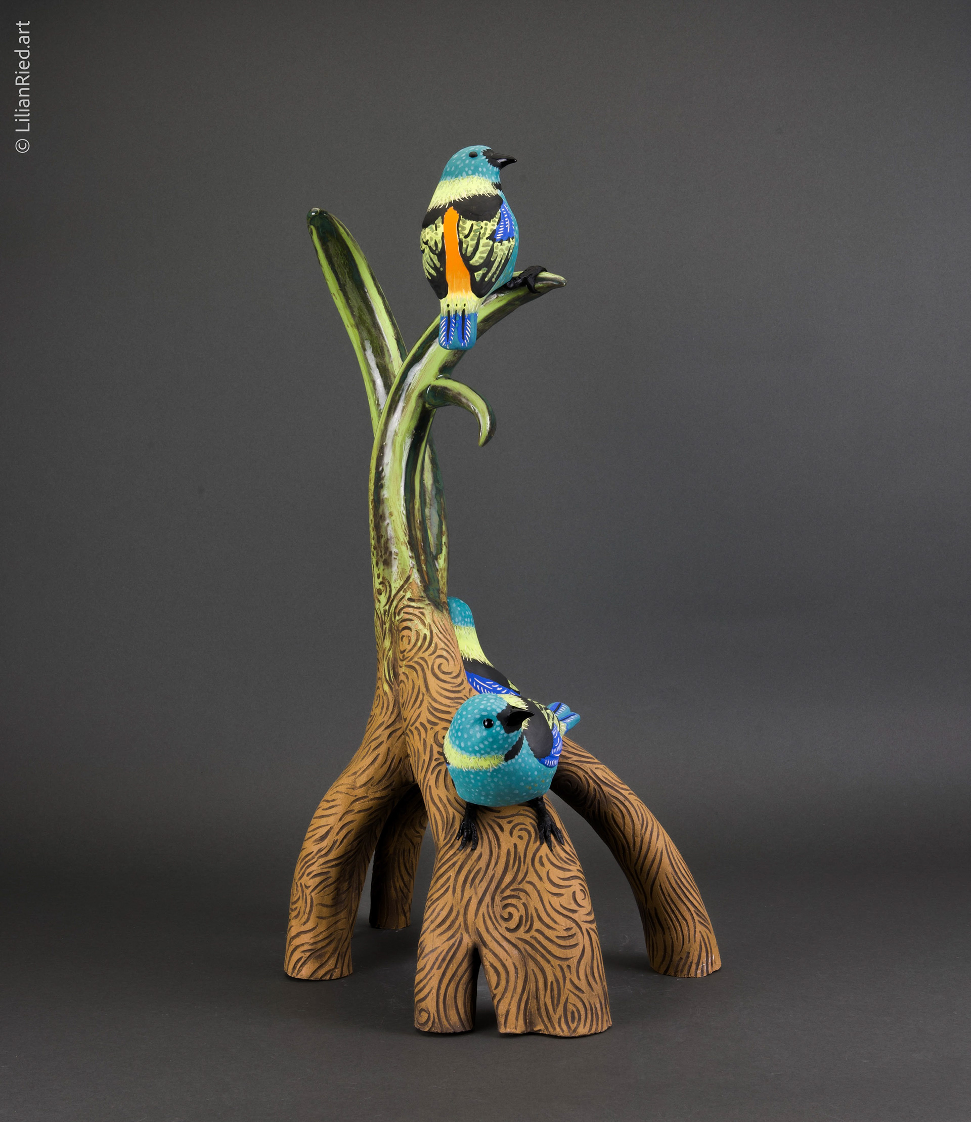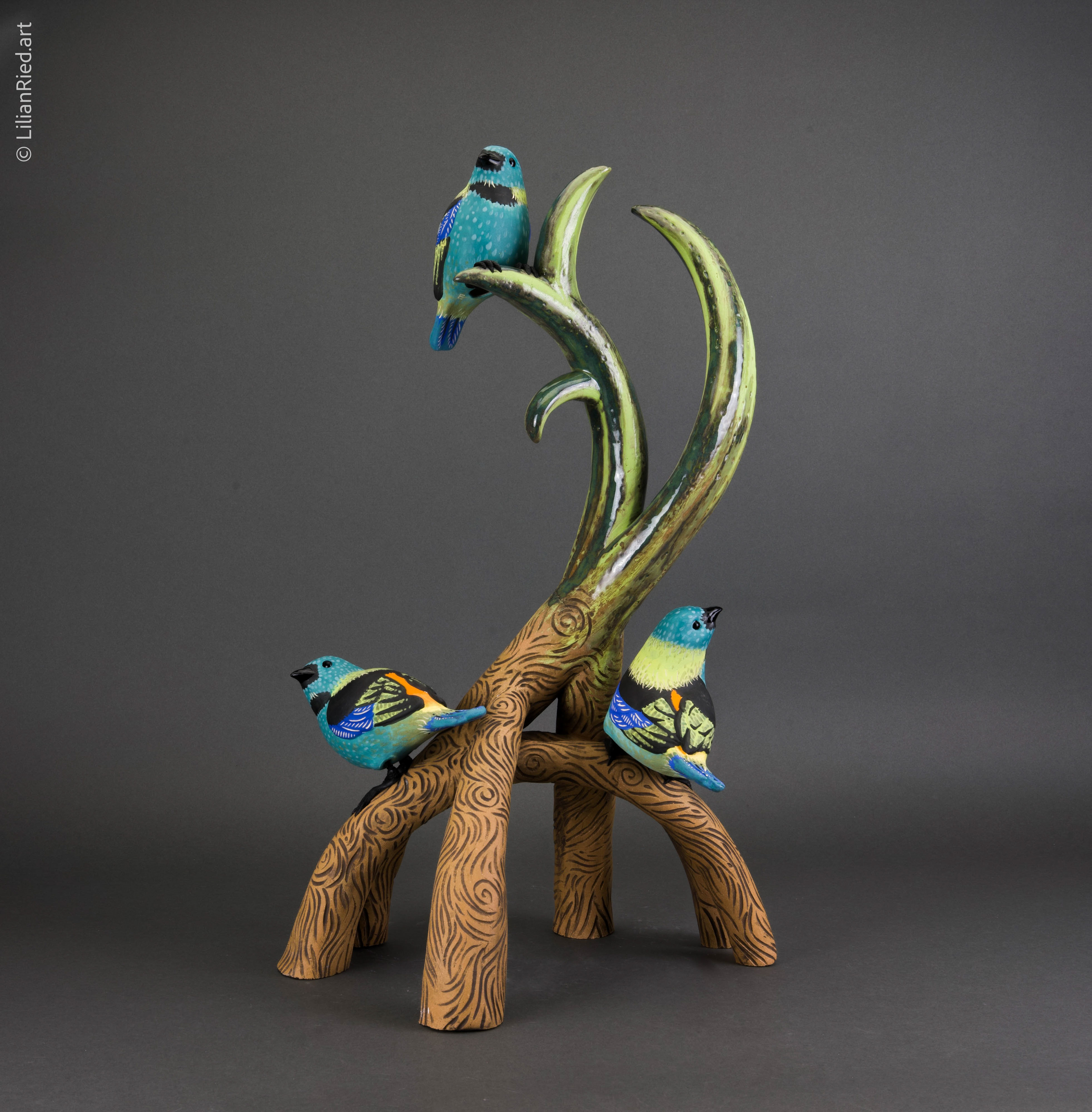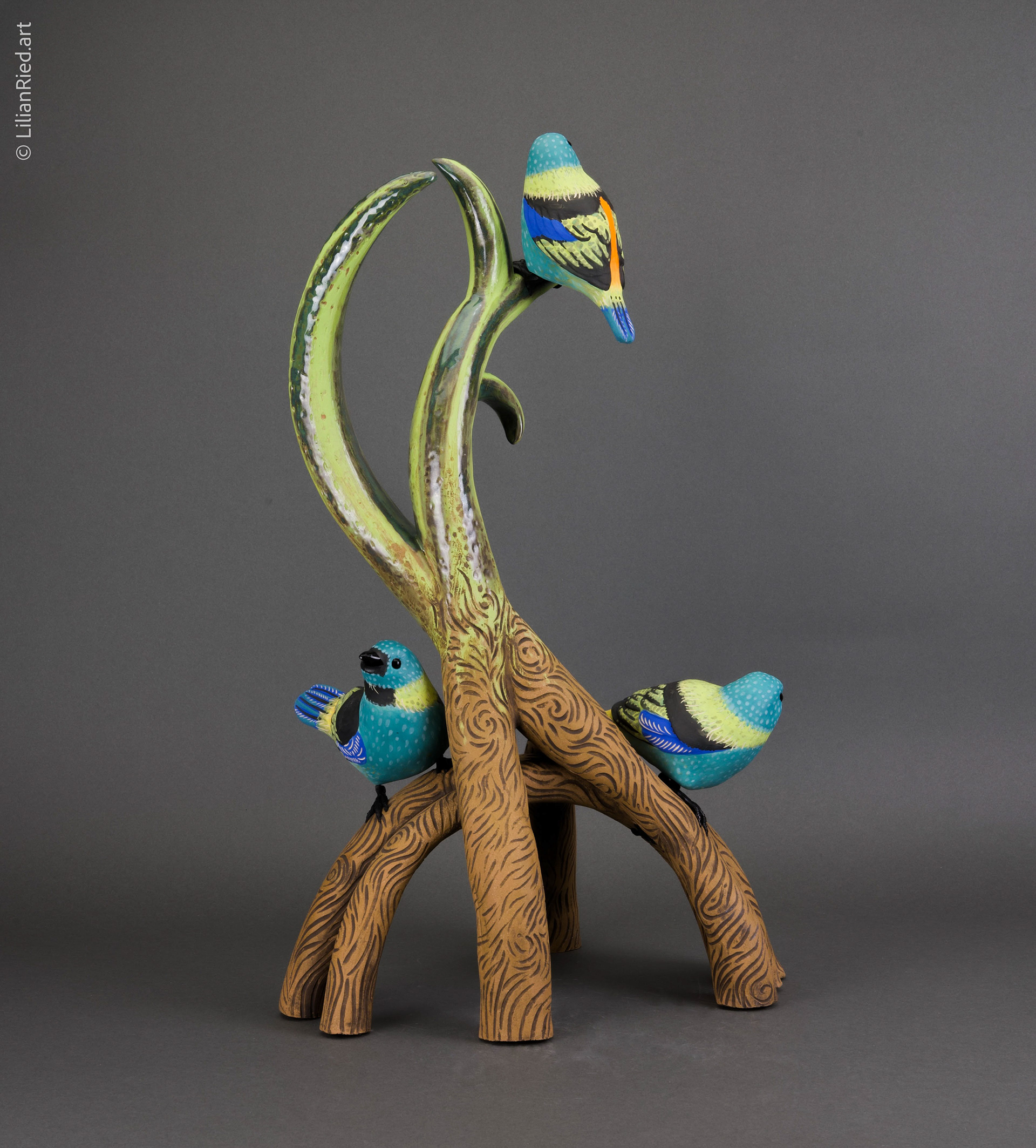 The Green-headed tanager (Tangara seldom) is a brightly colored bird found in the Atlantic forest in south-eastern Brazil, far eastern Paraguay, and far north-eastern Argentina. Saíra-sete-cores (seven colored saira) is his Brazilian name. This sculpture conveys the idea of a sanctuary inspired by mangrove roots and tropical vegetation where a group of saíras can gather together. The artist highlights the role of the natural environment as a habitat of abundance and protection, and the dichotomy of feelings of freedom vs belonging. Hand-built clay sculpture with slip-casted birds. Stoneware with glazes and oxide washes finishings; aluminum wire.