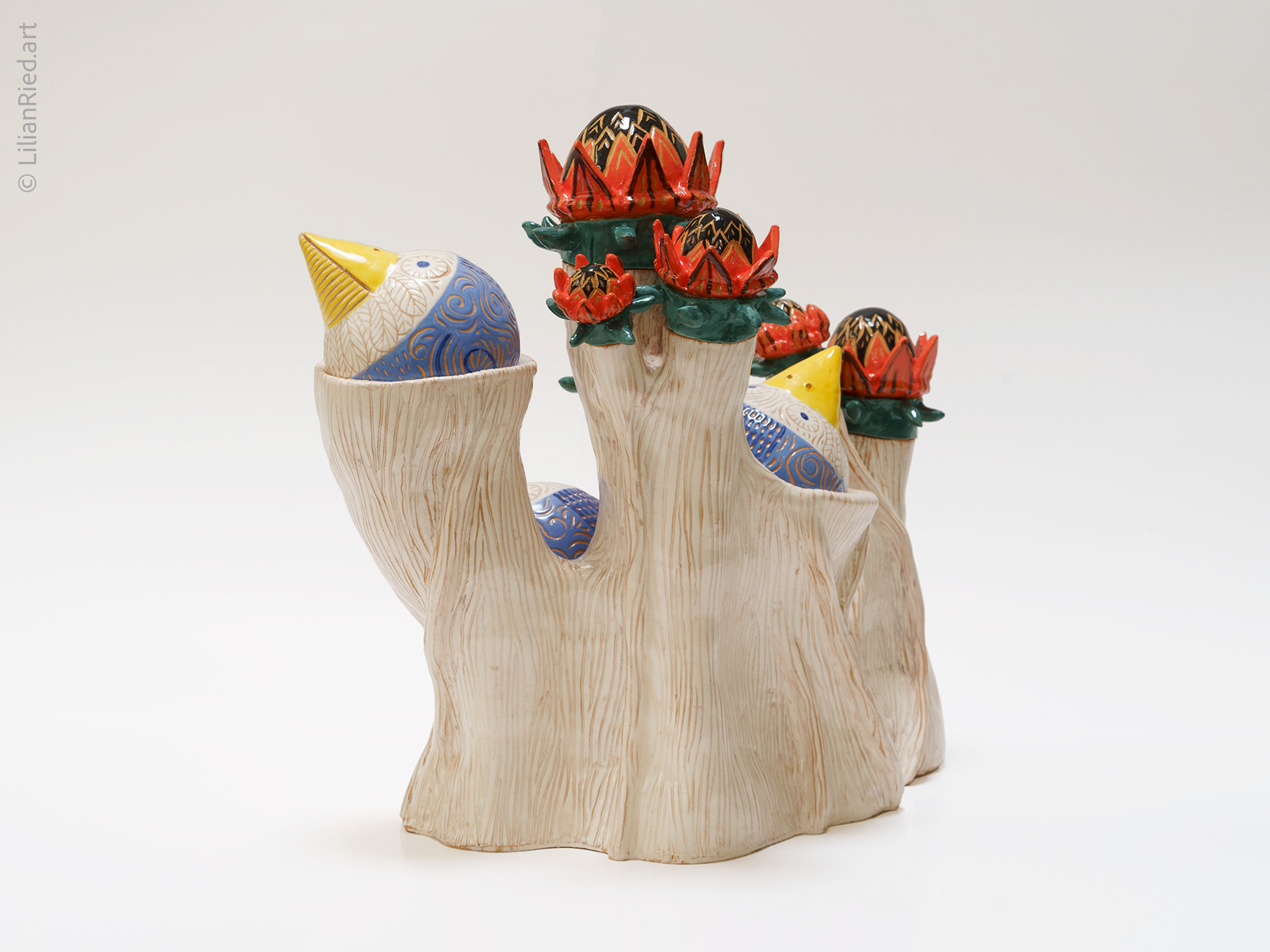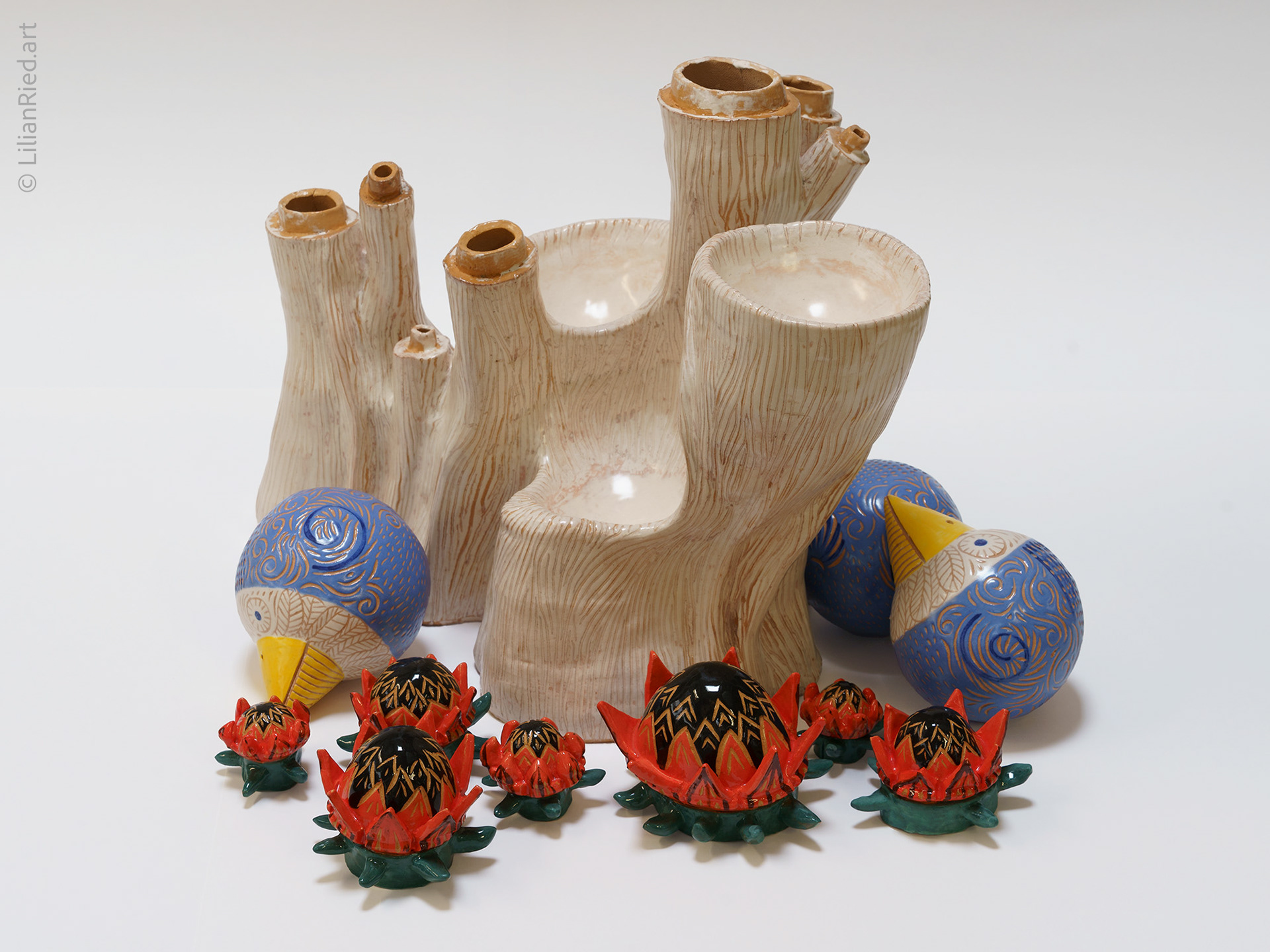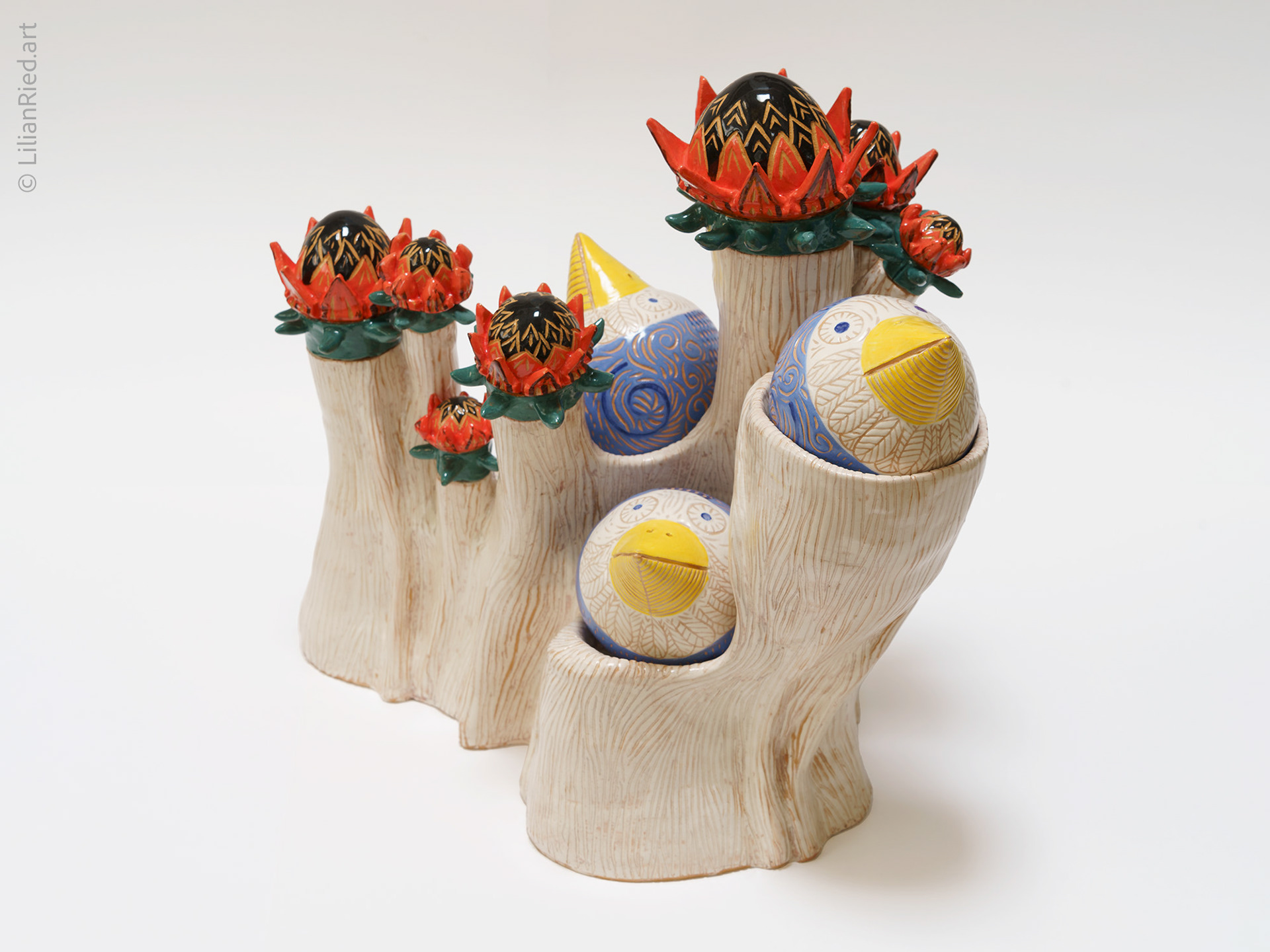 Set of 11 composite pieces. Earthenware handbuild with sgraffito and glaze finishes. The ludic composition of the sculpture allows interaction as we rotate the birds, exploring different postures.