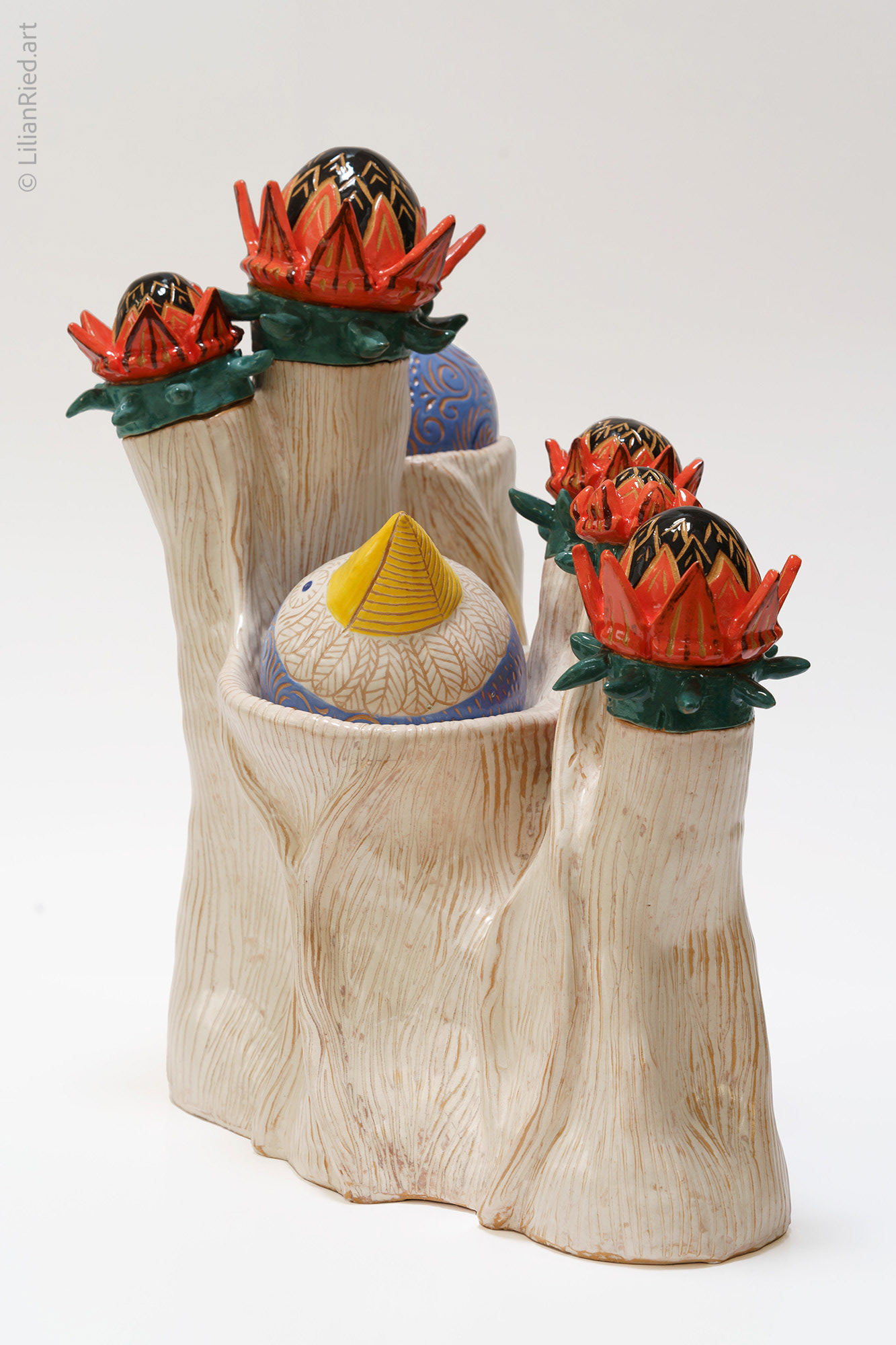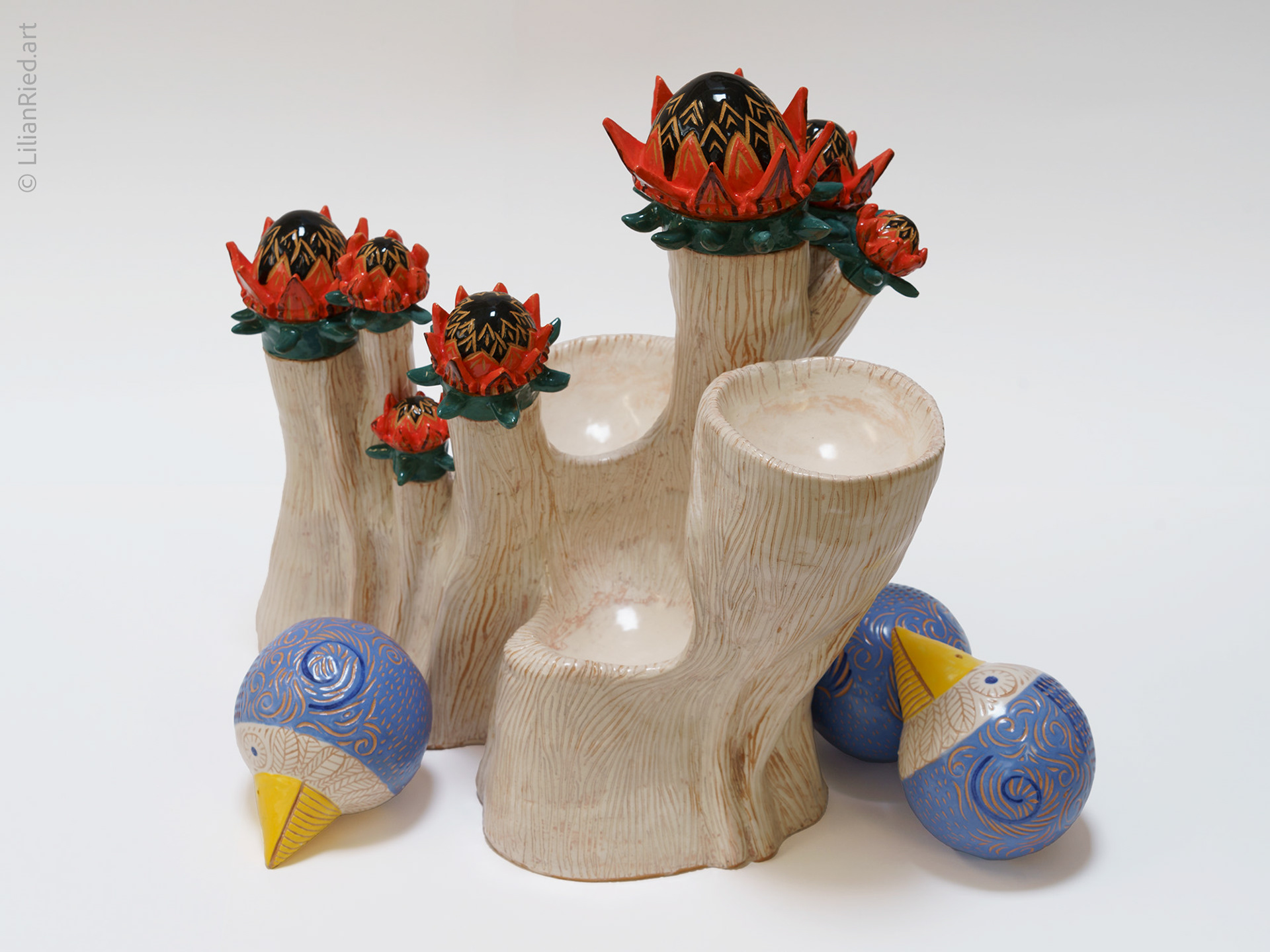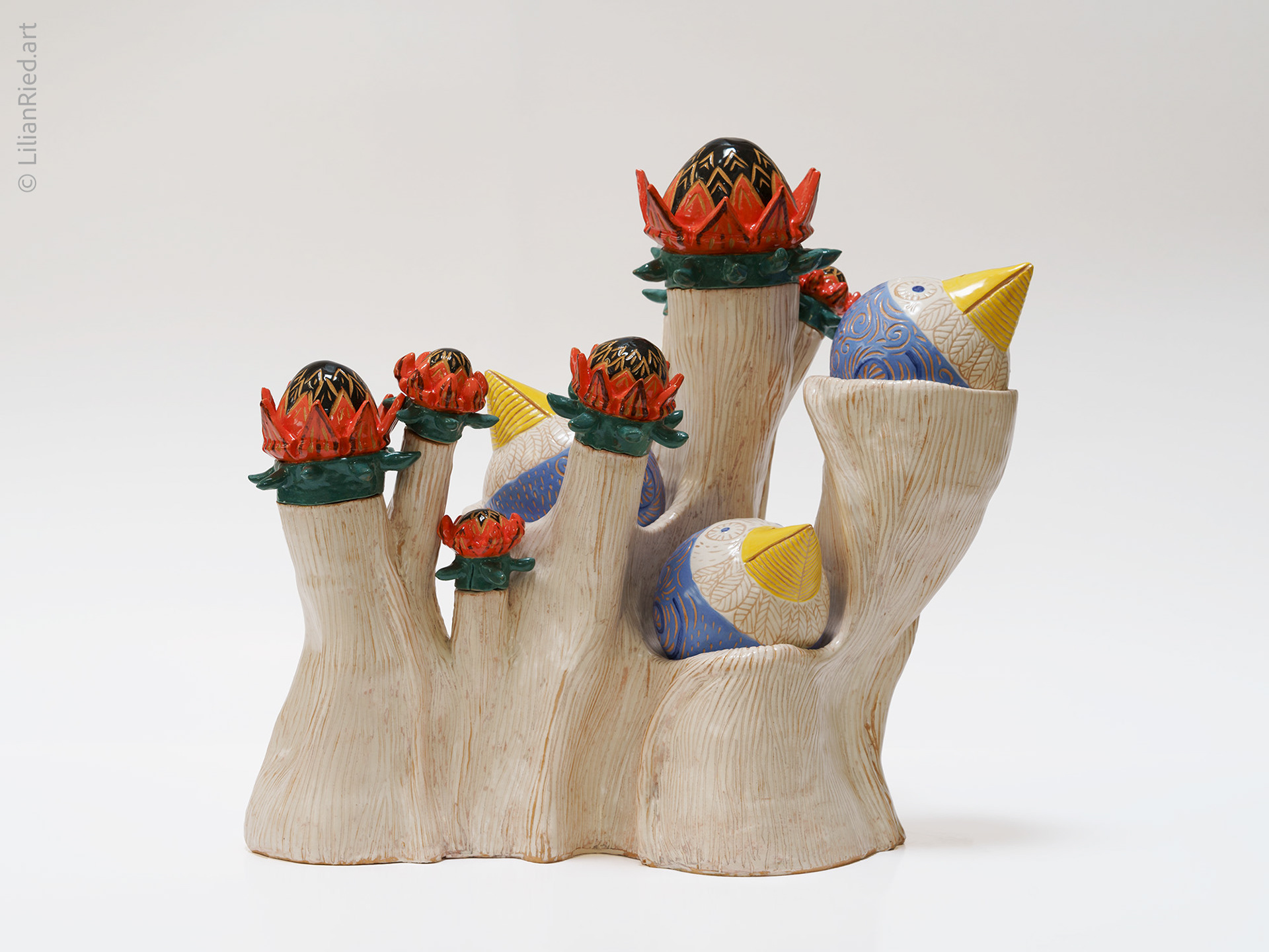 Set of 11 composite pieces. Earthenware handbuild with sgraffito and glaze finishes. The ludic composition of the sculpture allows interaction as we rotate the birds, exploring different postures.