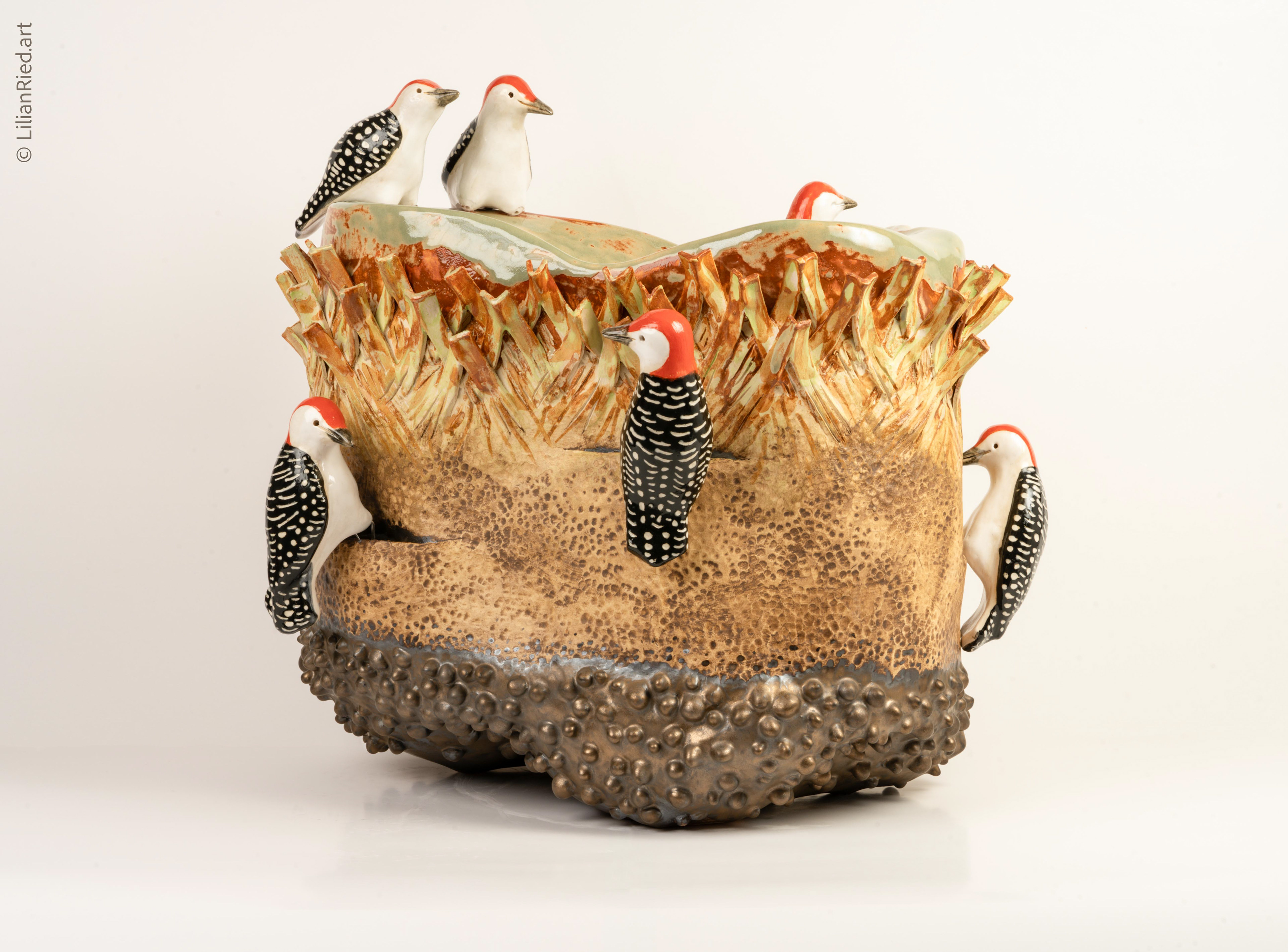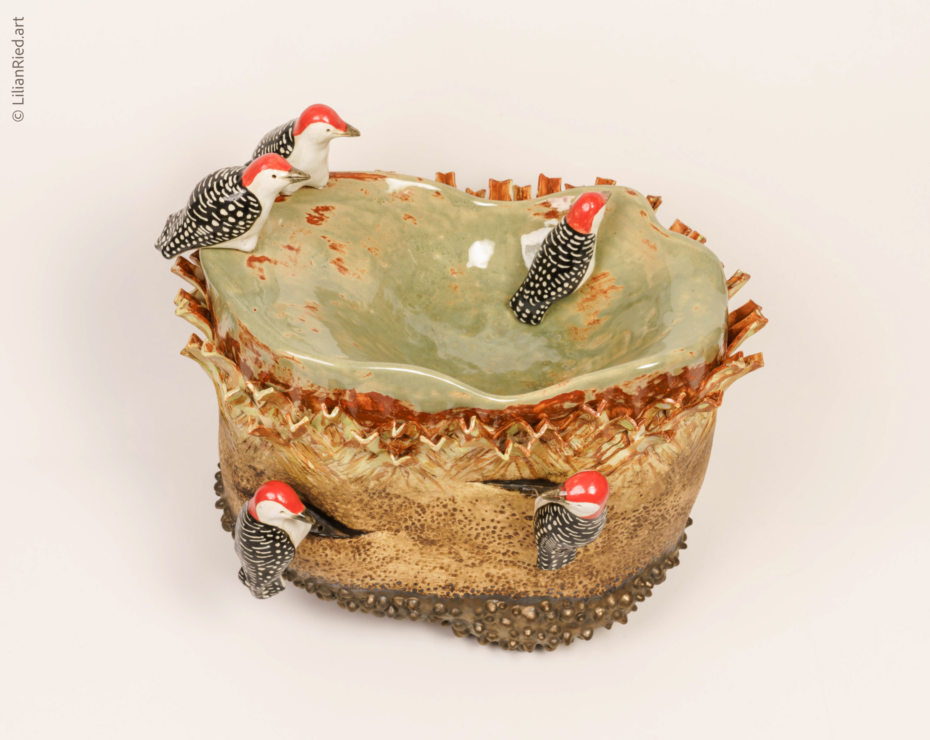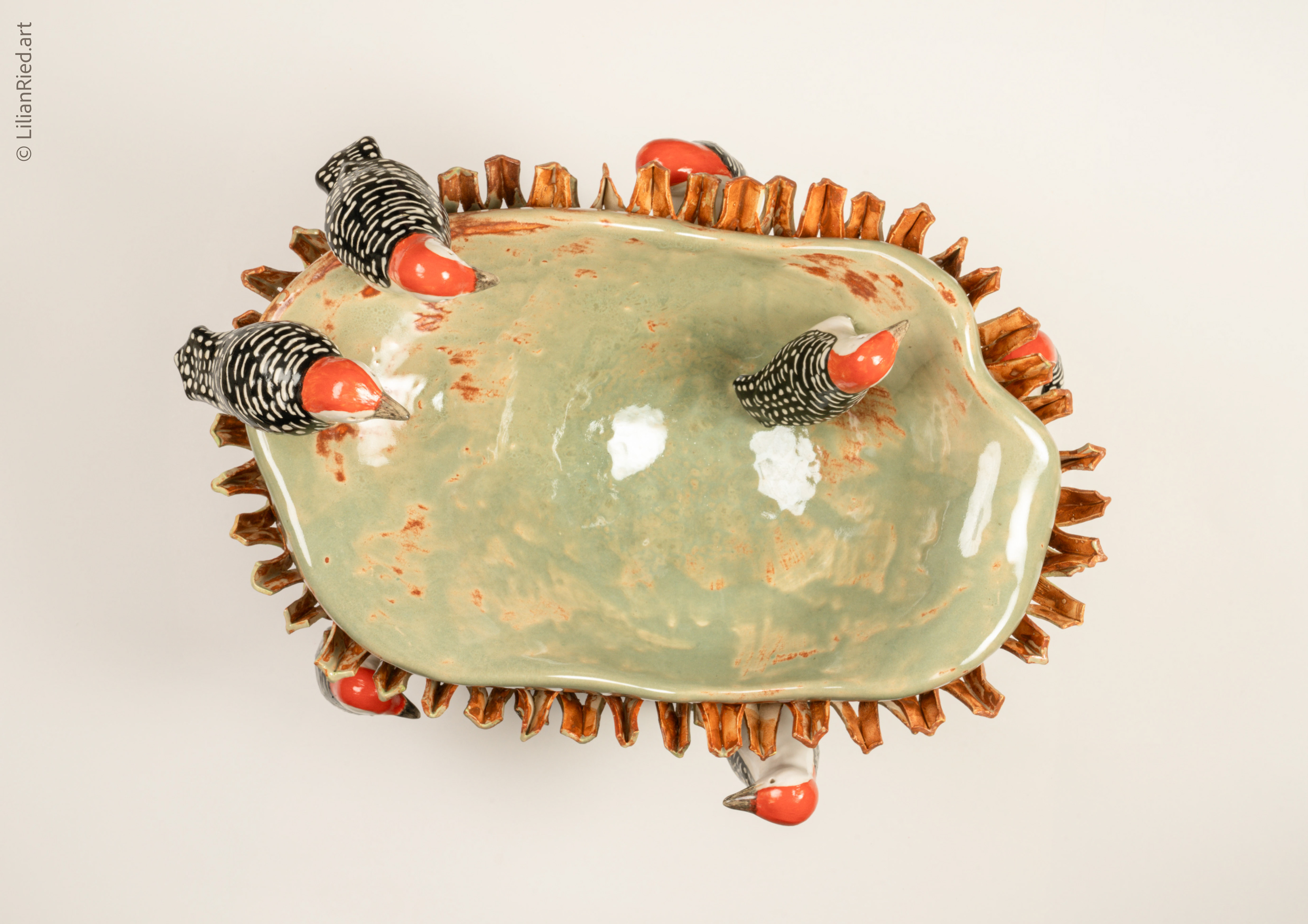 Set of 8 stoneware pieces finished with glazes and oxide washes. Hand-build, sprigging and sgraffito. The sculpture allows for different arrangements of the 7 woodpeckers around the palm inspired structure.