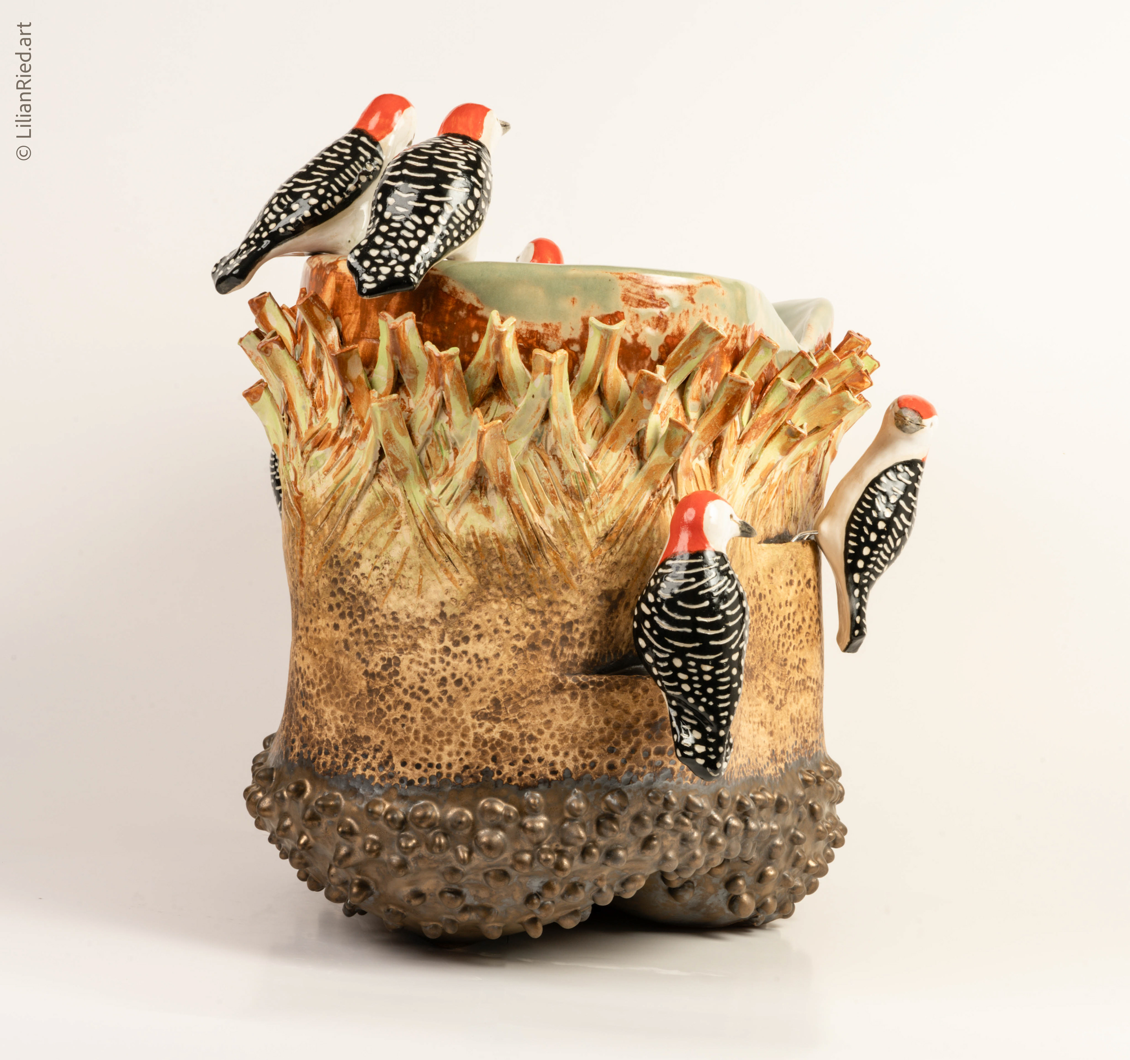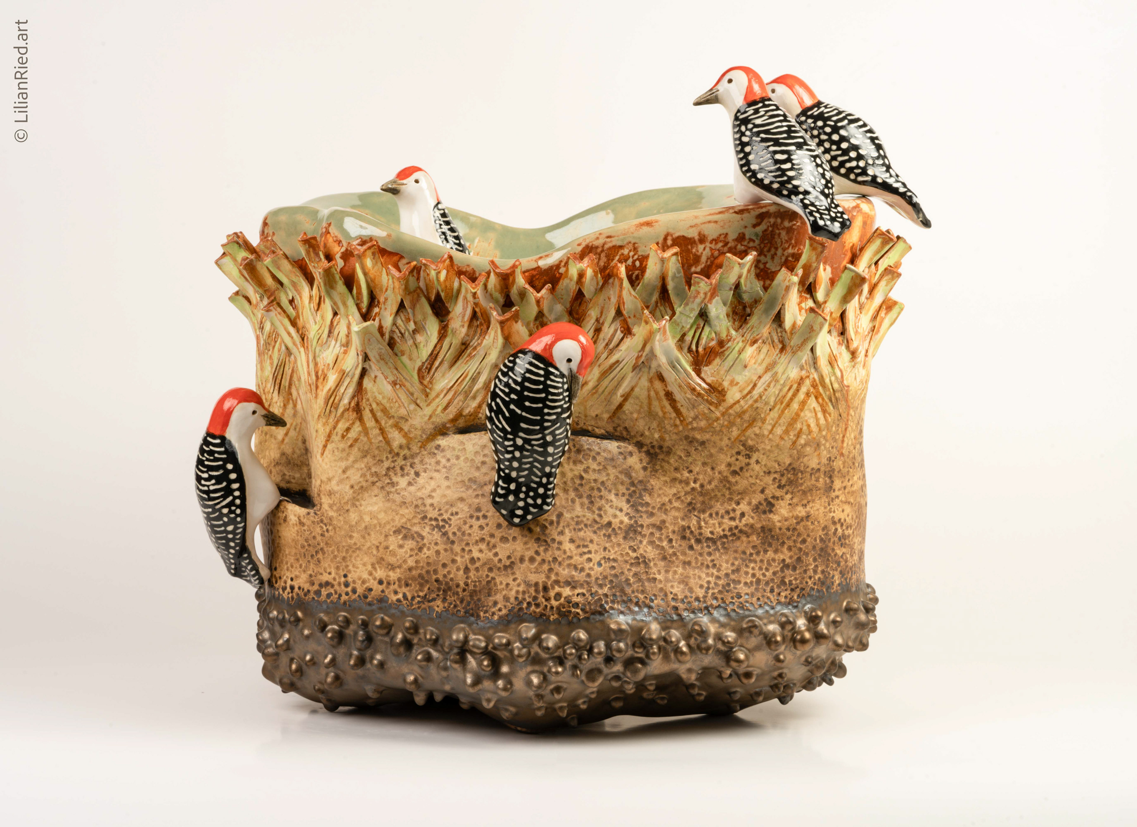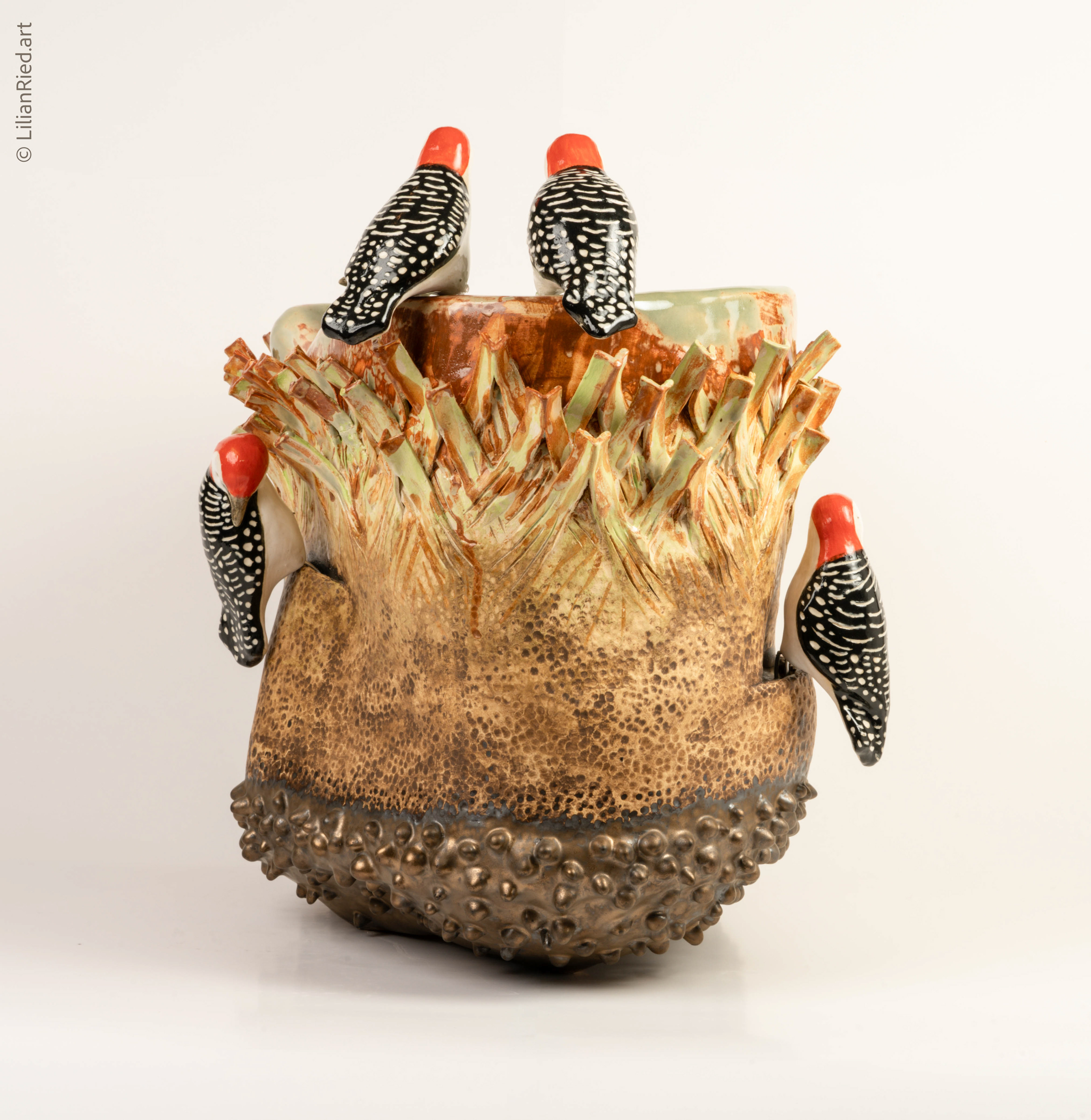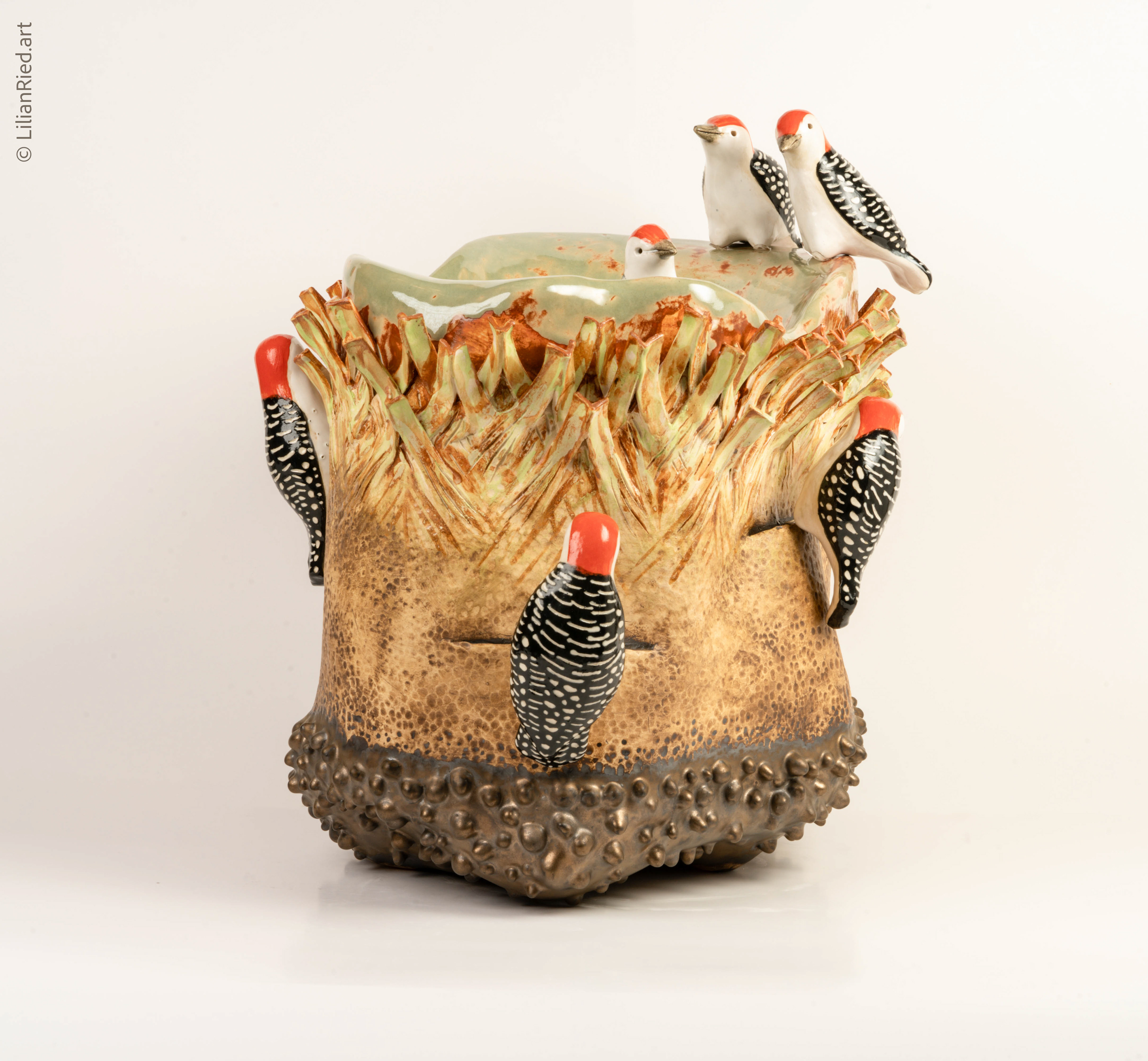 Set of 8 stoneware pieces finished with glazes and oxide washes. Hand-build, sprigging and sgraffito. The sculpture allows for different arrangements of the 7 woodpeckers around the palm inspired structure.